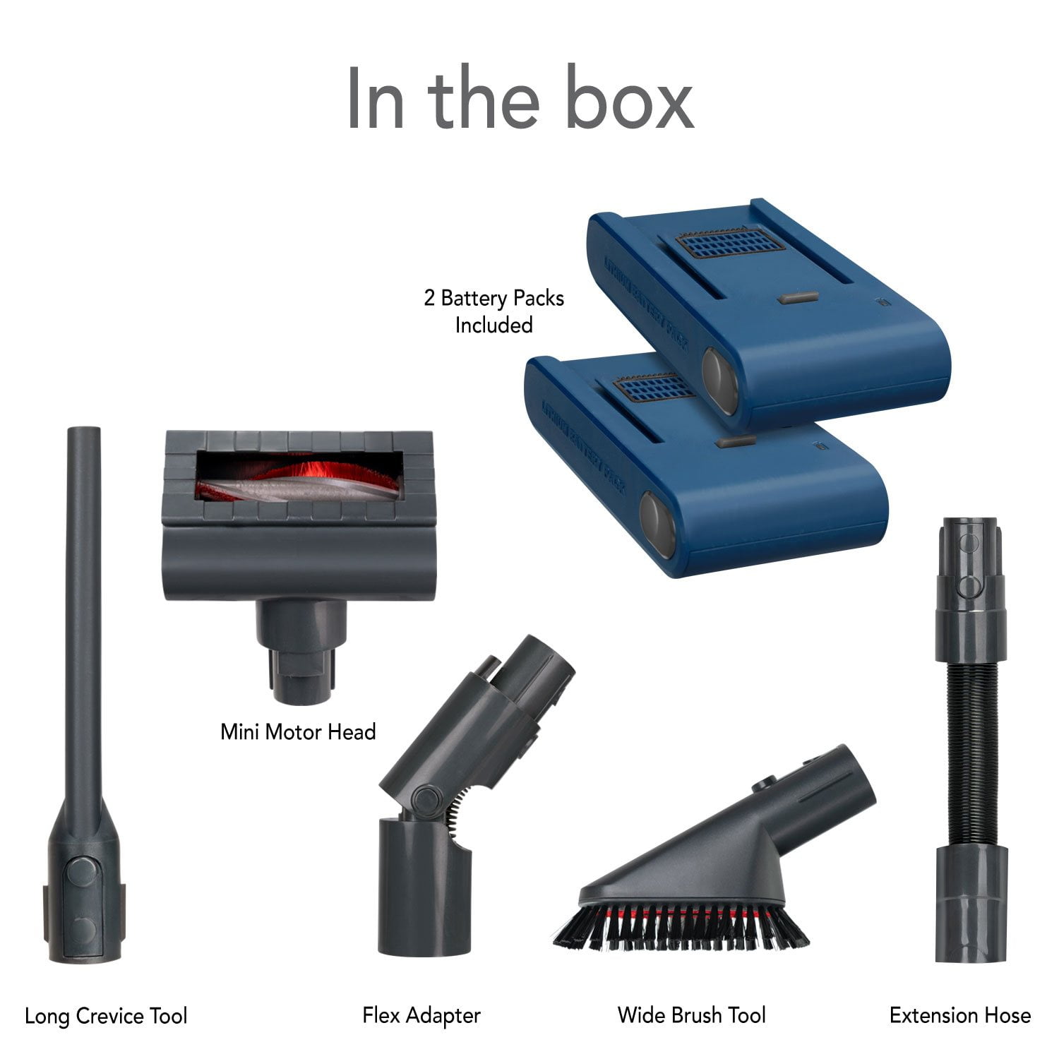 With 2 rechargeable battery packs included, this vacuum offers up to 100 minutes of run time, 50 minutes* for each battery, ensuring you can clean your entire home.