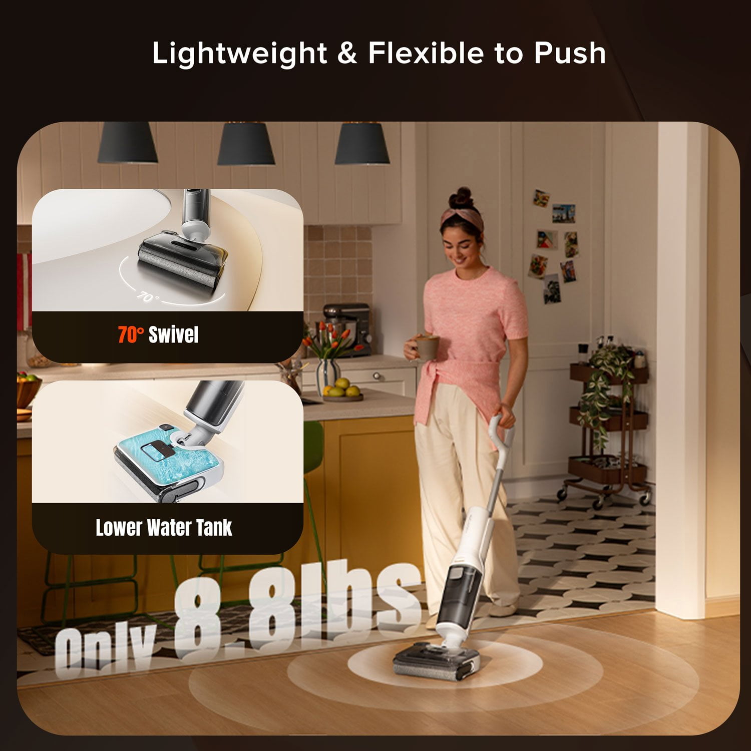 Weighing just 8.8 lbs, this cleaner offers a 180° lie-flat design and triple-edge cleaning system for reaching tight corners and under furniture. With 70° swivel steering and assistant wheels, cleaning becomes fast, easy, and fatigue-free.