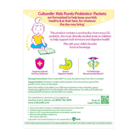 Culturelle Kids daily probiotic contains Lactobacillus rhamnosus GG, the most clinically studied strain in children, which works naturally with your child’s body to help support both immune and digestive health. The LGG strain in Culturelle has been shown to form a strong barrier in the digestive tract, activating your child’s natural defenses to protect it against nonbeneficial bacteria, helping to keep them healthy.