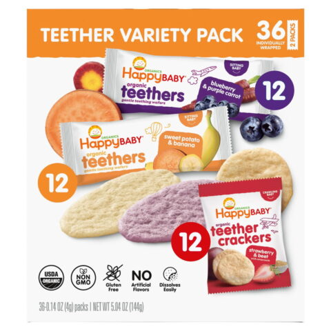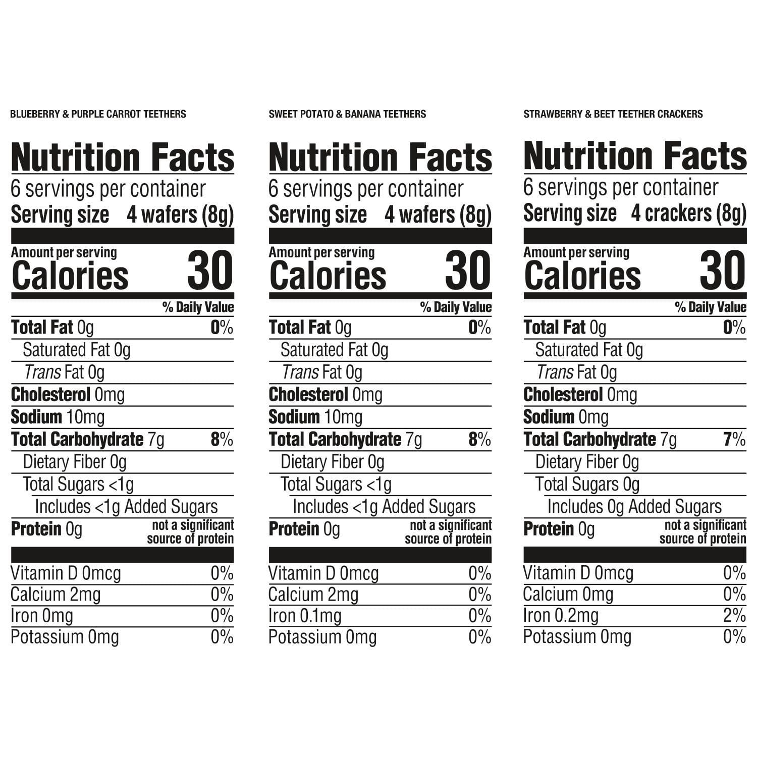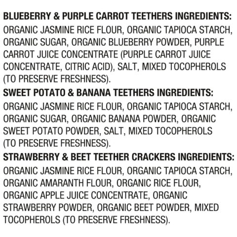 This variety pack includes 12, 2-packs of organic Sweet Potato & Banana Teethers, 12, 2-packs of organic Blueberry & Purple Carrot Teethers, and 12, 2-packs of organic Strawberry & Beet Teether Crackers. With three delicious flavors, your baby can enjoy a range of tastes while benefiting from organic ingredients.