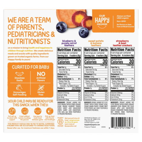 Happy Baby Teethers are USDA-certified organic and made with non-GMO ingredients grown without toxic persistent pesticides. The packaging is free from BPA, BPS, and phthalates, ensuring safety and quality for your baby. Choose Happy Baby Organic Teether Crackers for a wholesome and convenient teething snack.