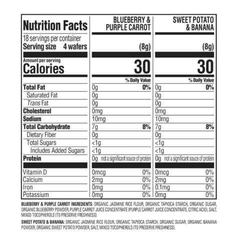 HappyBABY Teethers are easily dissolving and gentle on developing gums, making Teethers the go-to first snack for when baby’s teeth start coming in. This variety pack includes 24, 2-packs of our organic sweet potato & banana flavor as well as 12, 2-packs of our organic blueberry & purple carrot flavor: 72 gentle teething wafers per box!