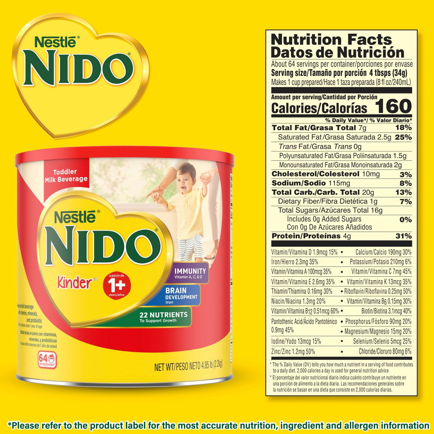Nestle NIDO Kinder 1+ Toddler Milk Beverage delivers 13 essential vitamins and minerals in every cup. This toddler drink contains Vitamin A, Vitamin C, Vitamin D, iron and zinc among other vitamins and minerals to help support healthy growth and development. NIDO Kinder 1+ toddler powder milk beverage now also includes a probiotic along with Vitamins A, C, D, Iron, Zinc to help support immunity. NIDO 1+ contains 19 mg Omega-3 DHA and iron to help support healthy brain development. This toddler milk beverage is easy to mix. Simply add 4 scoops of Nestle NIDO 1+ to 1 cup of warm water and mix well for a nutritional drink for toddlers you can trust for your child. As your child graduates from baby formula, and you search for a beverage for your toddler, NIDO has you covered. NIDO Kinder 1+ is for toddlers ages 1-3. Each 4.85 pound canister of toddler milk beverage contains approximately 64 servings of NIDO Kinder 1+. Store your can of NIDO Kinder 1+ in a cool, dry place.