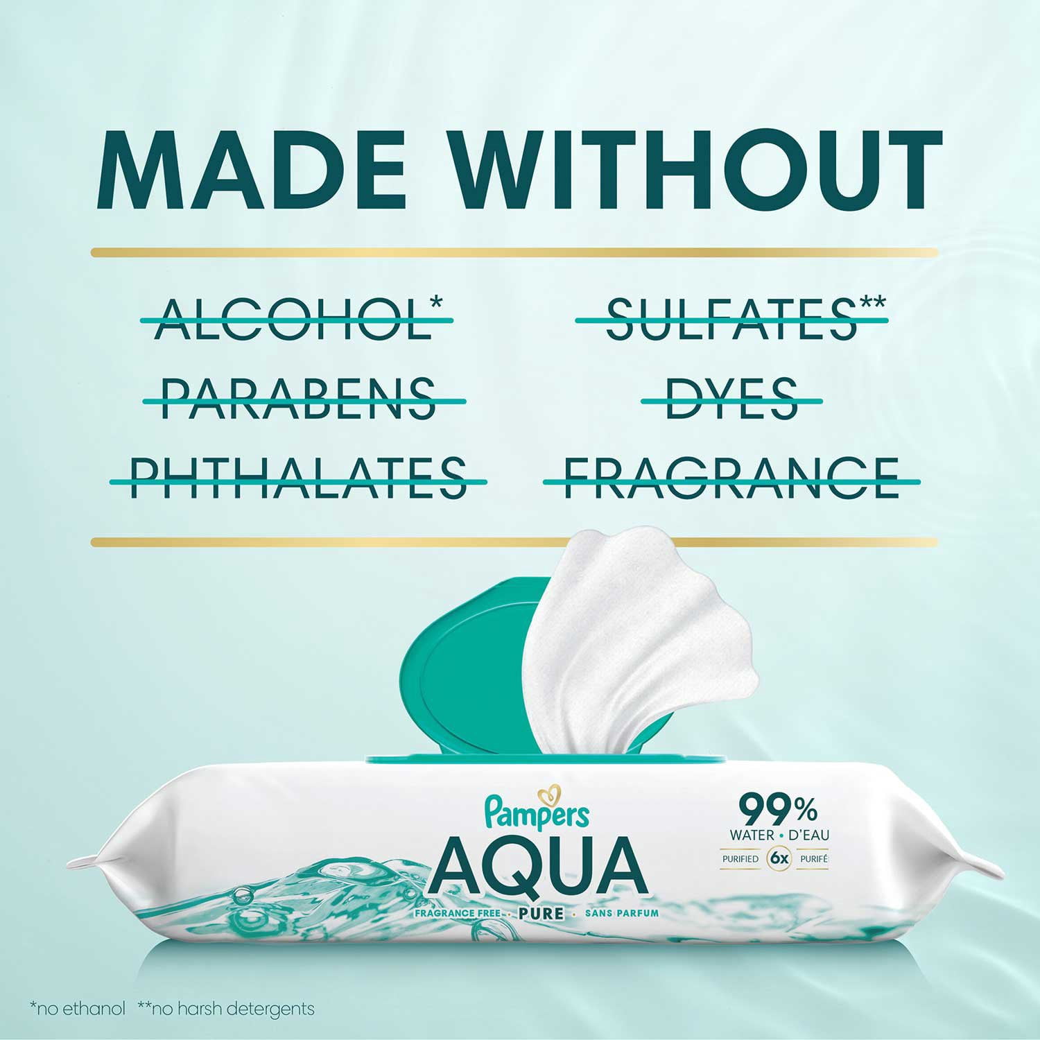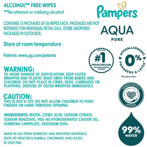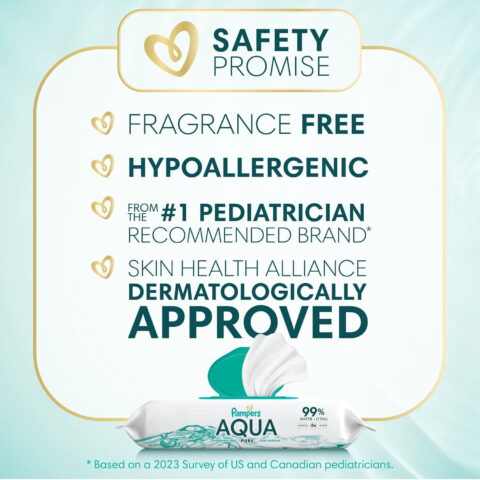 Pampers Aqua Pure wipes are clinically proven mild, meaning they are safe for newborn babies’ skin and are gentle enough for babies’ bottoms, hands, and delicate faces. Aqua Pure wipes are also endorsed by the leading pediatric dermatologists as being as mild on skin as a water and washcloth. They are dermatologist approved by the Skin Health Alliance.