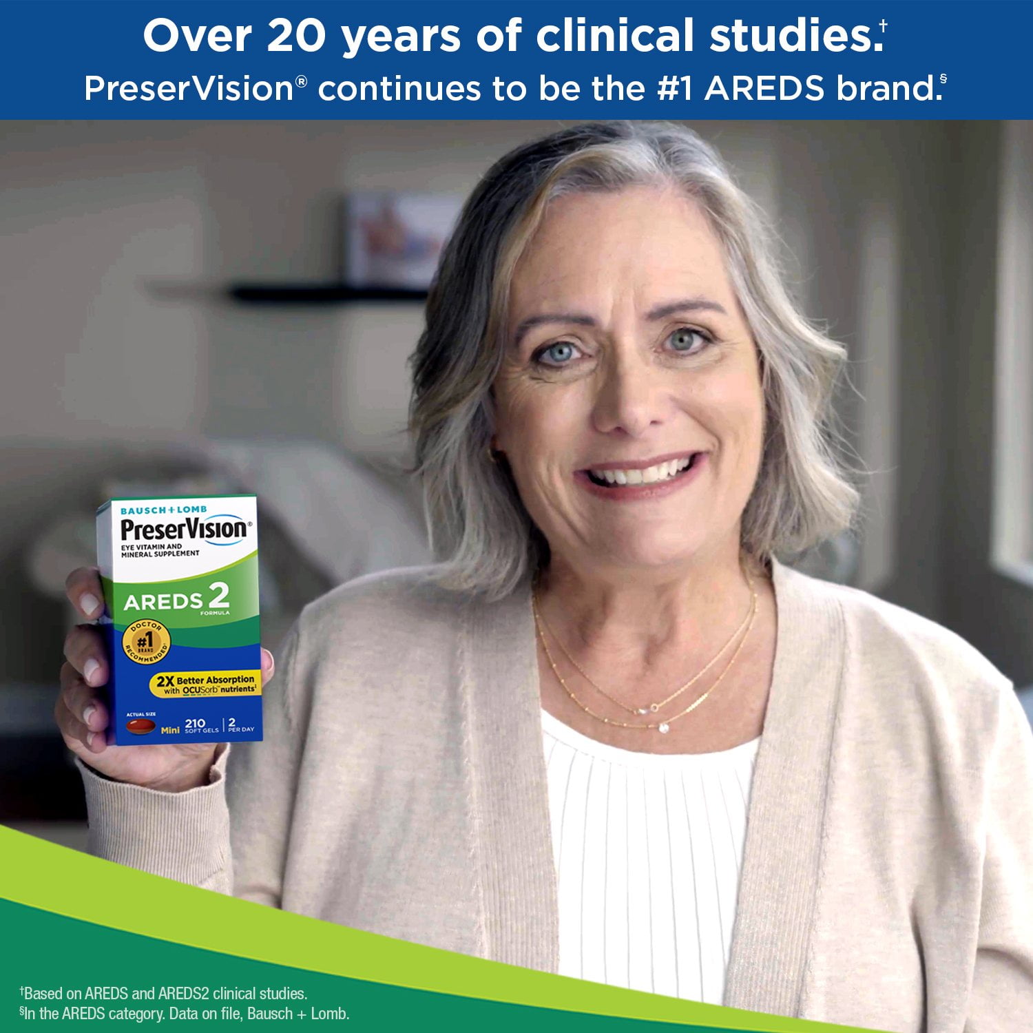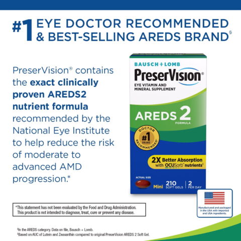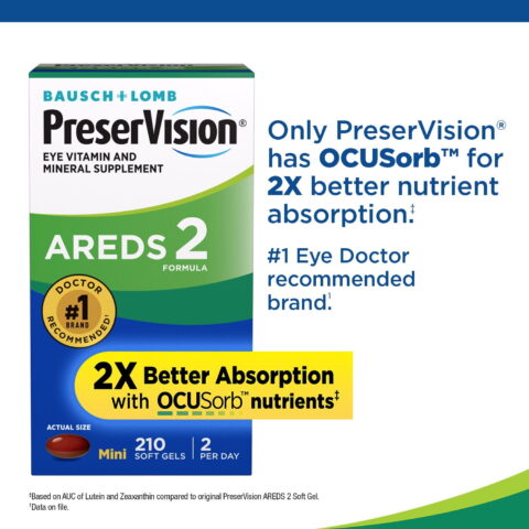 PreserVision AREDS 2 Formula soft gels are eye supplements that build on the original, clinically proven PreserVision AREDS Formula. This updated formula includes lutein and zeaxanthin replacing beta-carotene based on the NEI’s Age Related Eye Disease Study 2 (AREDS2). It’s the #1 doctor recommended eye vitamin brand (data on file, Bausch + Lomb) and is based on 20 years of clinical studies conducted by the NEI.