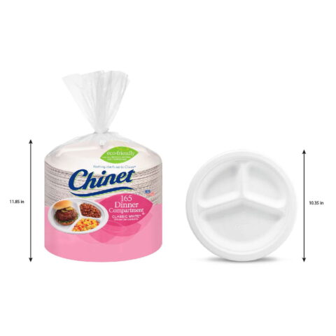 Enjoy stylish table settings at your next special event with Chinet® Classic White™ 10-3/8″ Dinner Compartment Plates. They’re durable and eco-friendly, and they’re designed to make entertaining fun and easy. Snack time. Mealtime. Craft time. The Chinet Classic® compartment plate (165 count) is made for those times you need a place for everything and everything in its place. Whether it’s dividing your saucy ribs from your salad or your burger from your brownie, we help keep it all where it needs to be with three convenient sections.