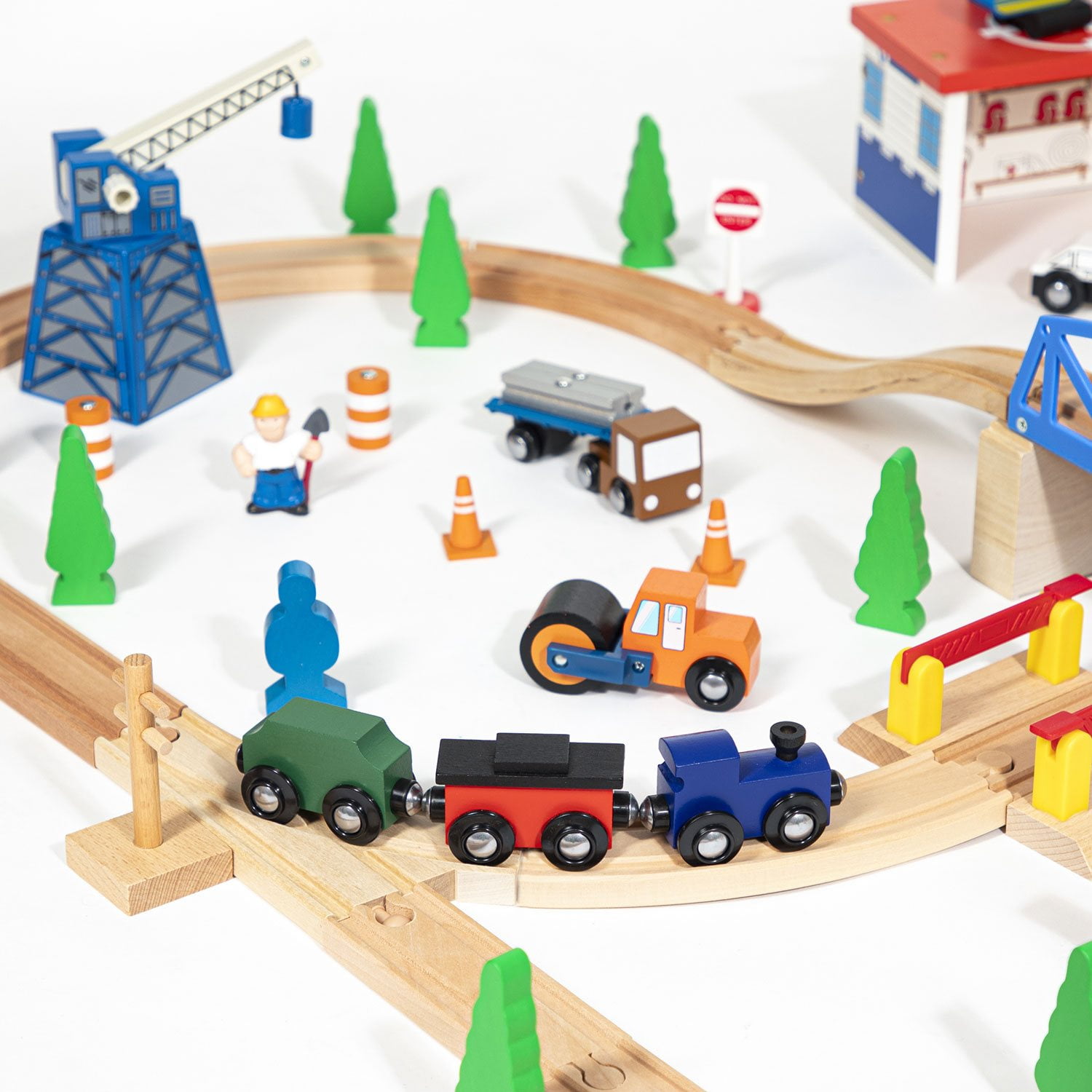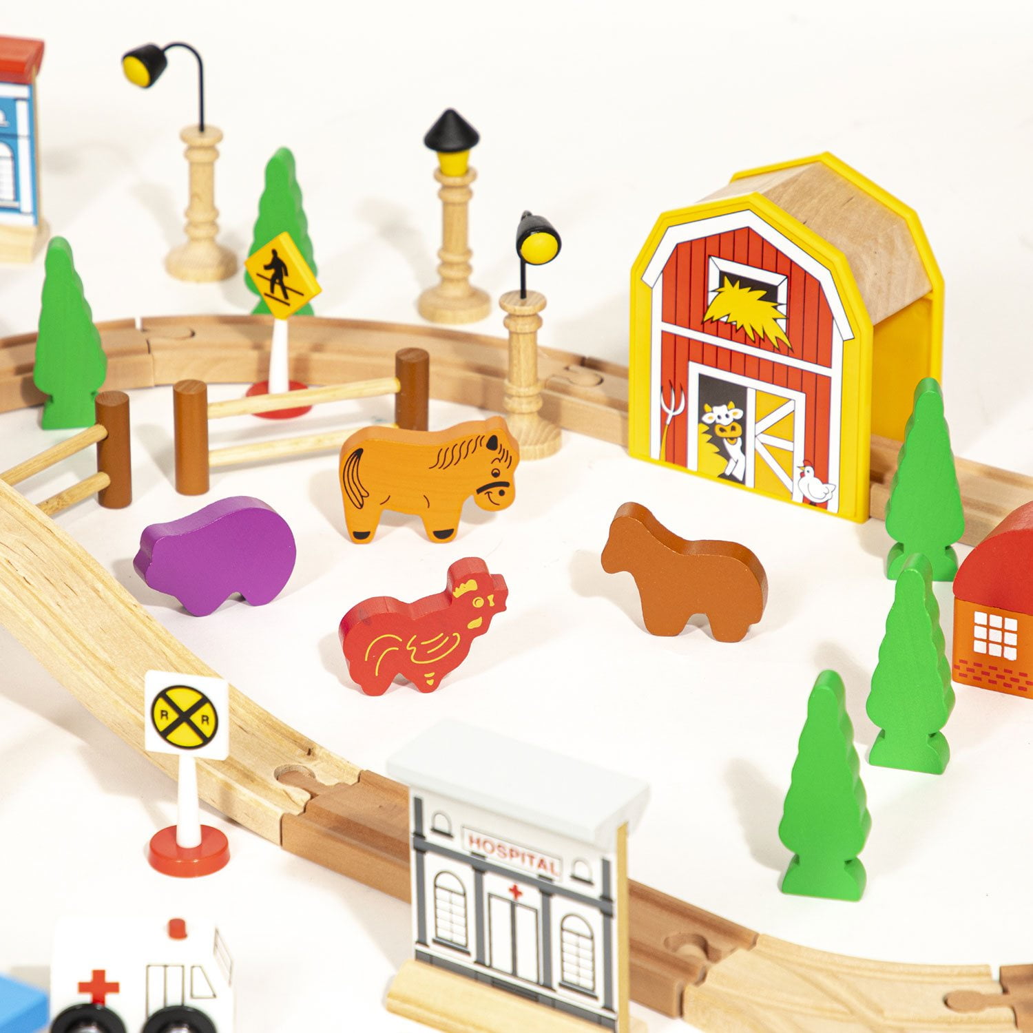 Embark on an adventure with this 100 piece wooden train set, one of the most exhilarating sets available. This set boasts an extensive amount of wooden train track that allows for a multitude of configurations. Journey through bridges, buildings, and farmlands, and interact with a variety of vehicles and animals.