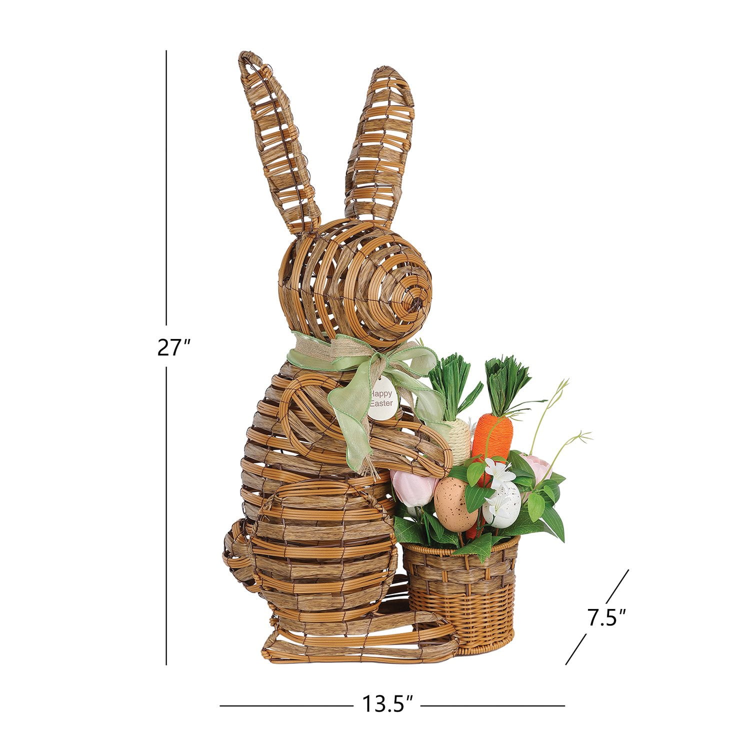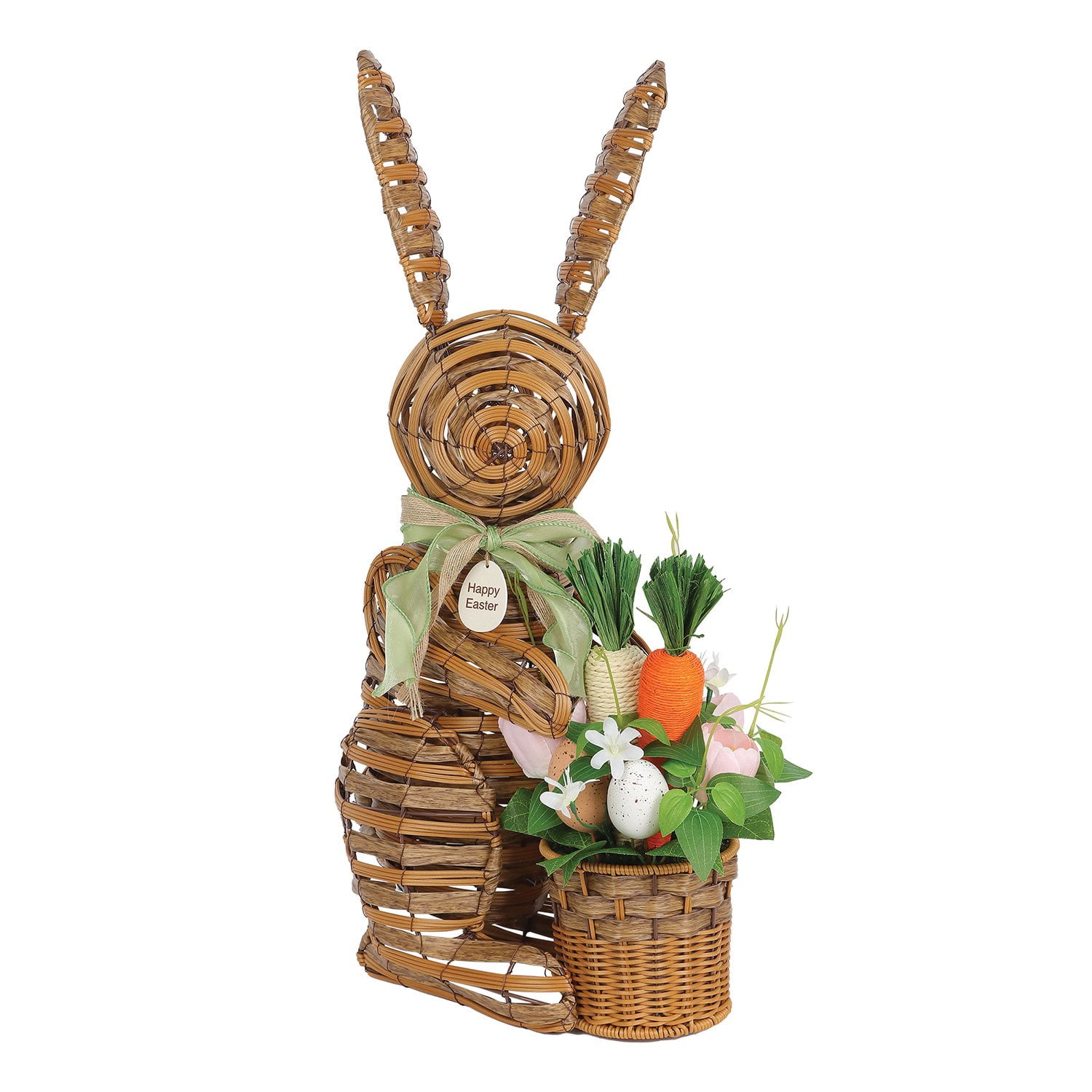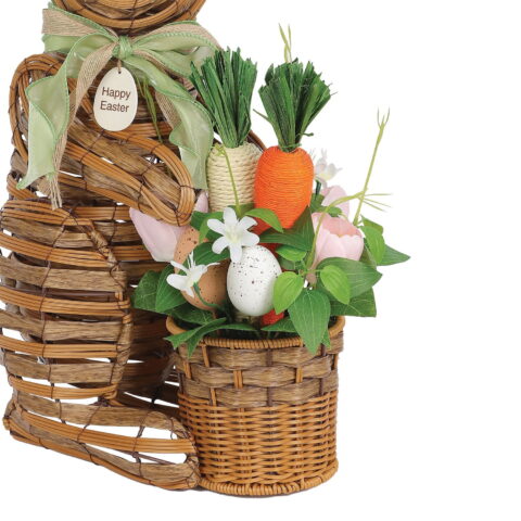 Perched on a sturdy steel frame, this bunny holds a sweet basket filled with hand-crafted carrots, vibrant tulips, lush lifelike faux jasmine, and decorative eggs. The playful pops of color from the carrots and the refreshing touch of jasmine foliage create a serene and elegant display, inviting the promise of new beginnings.