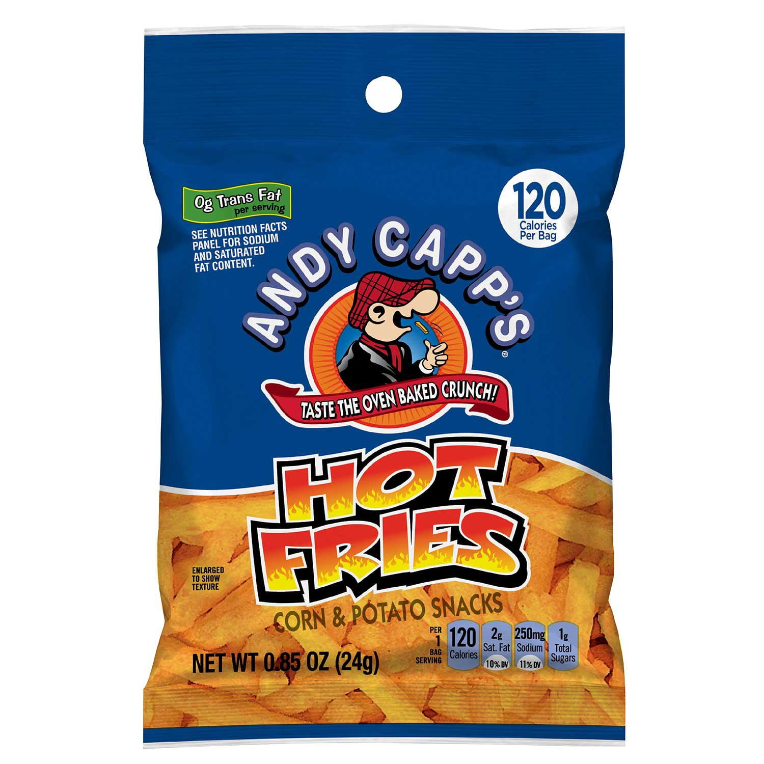 These Hot Fries are great for individual resale. You can place them in a vending machine, convenience store, concession stand, or fundraising booth. They’re individually labeled for resale. Andy’s Baked Hot Fries have no trans fat. They’re a great crunchy and delicious snack to have on hand and enjoy in between meals.