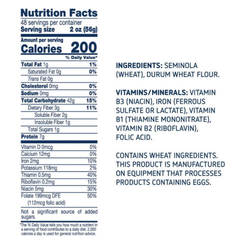 This bulk package holds six boxes of three different varieties of Barilla pastas—two elbow macaroni boxes, two penne pasta boxes and two spaghetti pasta boxes, for a total of about 48 servings of pasta. The pasta in this multipack are also an excellent source of vitamin B1, vitamin B3, vitamin B2, iron and folic acid and is suitable for vegetarians and vegans. Barilla pasta is low fat, cholesterol-free, sodium-free, trans-fat-free and provides a good amount of protein.