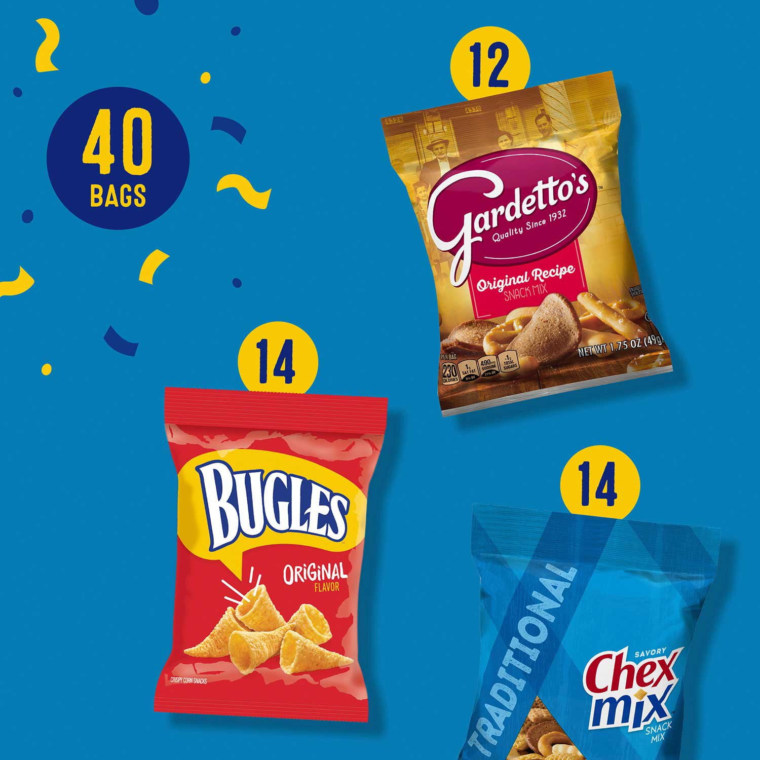 This variety pack contains a total of 40 snack bags: 12 Gardetto’s, 14 Bugles Original, and 14 Chex Mix Traditional. Convenience is the name of the game with Chex mix individual packs, Gardetto’s snack mix individual packs, and Bugles individual packs. These snack mix packs are great party favors and fit perfectly in school lunches.