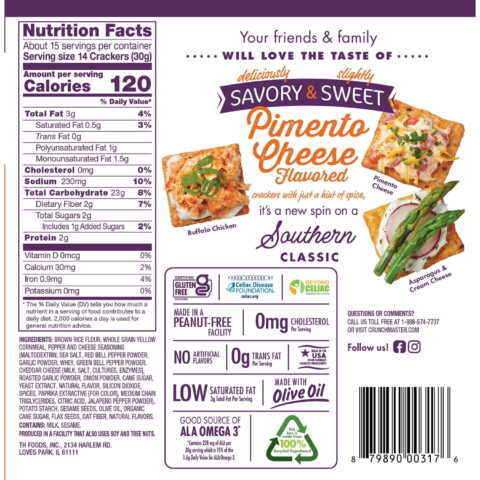 • Tasty, crunchy Pimento Cheese inspired baked multigrain crackers