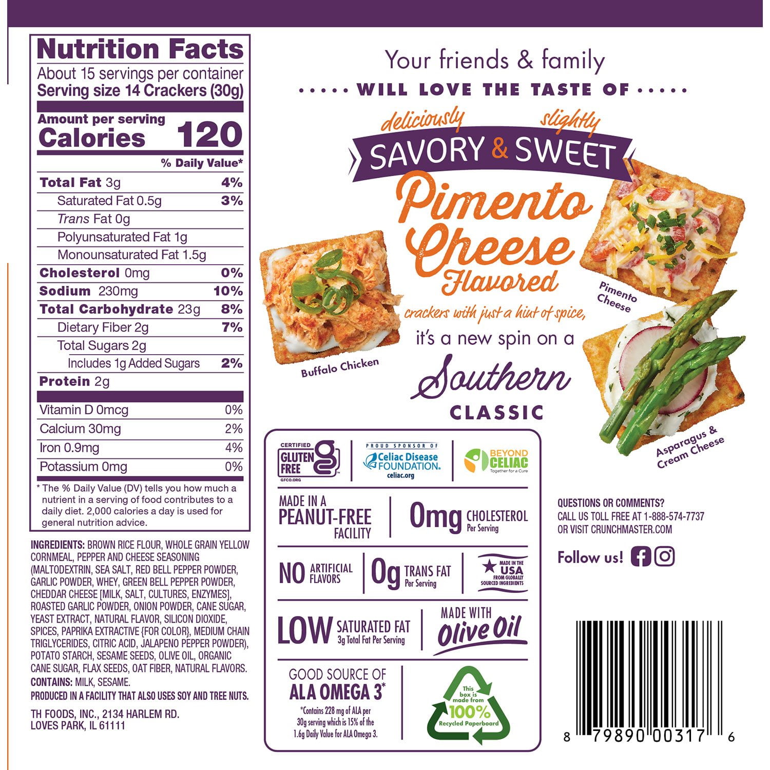 Crunchmaster Pimento Cheese Crackers are gluten-free, non-GMO certified, have no artificial flavors, 0mg Cholesterol per serving, 0g Trans Fat per serving, a good source of ALA Omega 3, and are made with olive oil. Healthy snacking that tastes great!