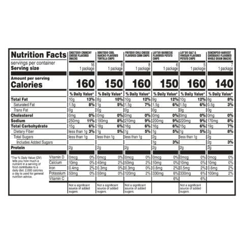 In this Frito Lay’s variety pack, you’ll enjoy a classic mix of chips and snacks that have been pleasing taste buds for years. These snacks are not just delicious; they are part of a tradition of good fun and great taste. This pack includes 6 Lay’s BBQ, 7 SunChips, 5 Lay’s Salt & Vinegar, 16 Cheetos, 8 Doritos CR, and 8 Fritos. Each snack is packed with flavor and ready to be enjoyed.