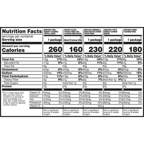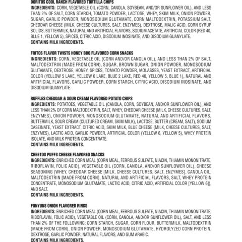 • Variety pack of Doritos, Ruffles, Funyuns, Cheetos and Fritos