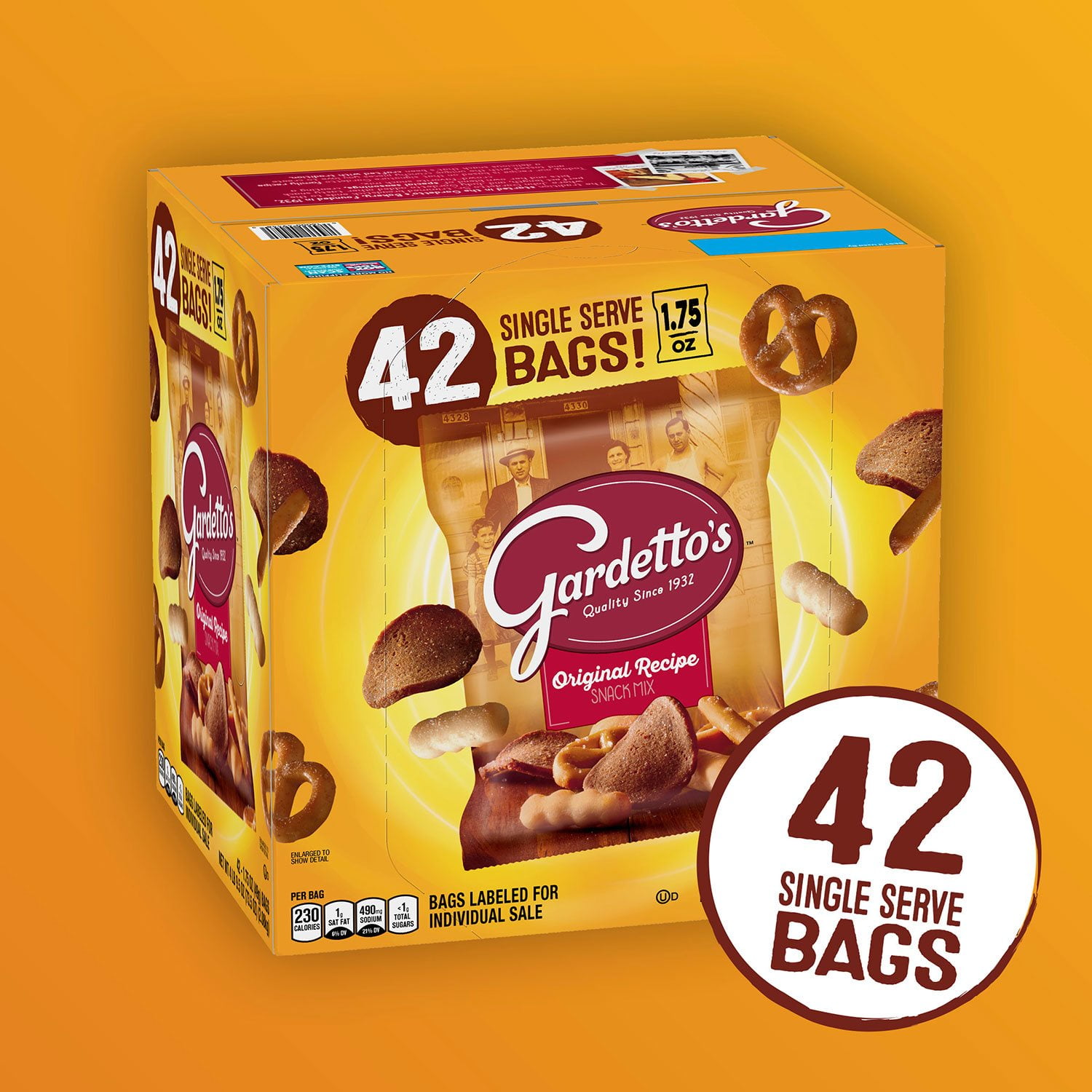 This extra value pack of Gardetto’s Original Recipe Snack Mix contains 42 single-serving 1.75-oz. bags. The bags are fantastic for packing in brown bag lunches and are just the right size for resale in convenience stores, cafeterias, and sandwich shops. It’s a tasty alternative to everyday chips! The bags are also labeled for individual resale, for added convenience.