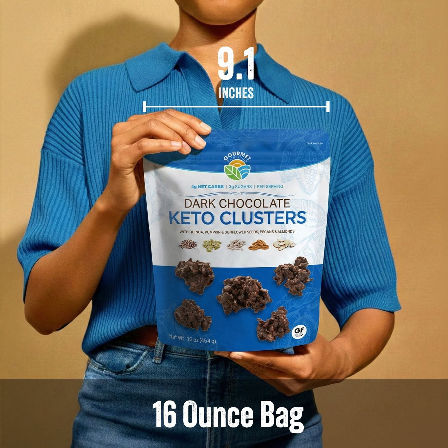 Every 16-ounce resealable package of Gourmet Gatherings Dark Chocolate Keto Clusters is packed with premium ingredients. Enjoy the crunch of pecans and almonds, mixed with super seeds like pumpkin, sunflower, and quinoa. Each cluster is enrobed with Belgian Couverture Dark Chocolate, adding a rich and luxurious touch to every bite.