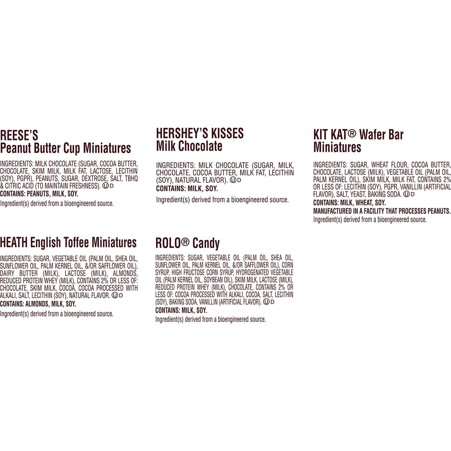 • Includes HERSHEY’S KISSES milk chocolate candy, REESE’S milk chocolate peanut butter cups, ROLO® rich chocolate caramel candy, KIT KAT® milk chocolate wafer bars and HEATH chocolatey English toffee bars