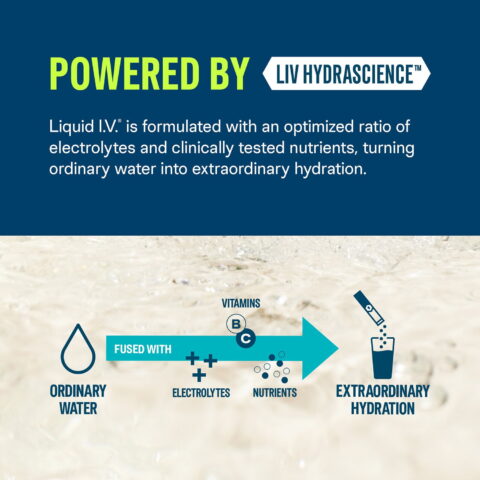 Liquid I.V. products utilize LIV Hydrascience™, a cutting-edge technology designed to deliver hydration faster than water alone. With an optimized ratio of electrolytes and clinically tested nutrients, this scientifically formulated mix transforms ordinary water into extraordinary hydration. Perfect for replenishing electrolytes and fluids lost during sweat or exercise.