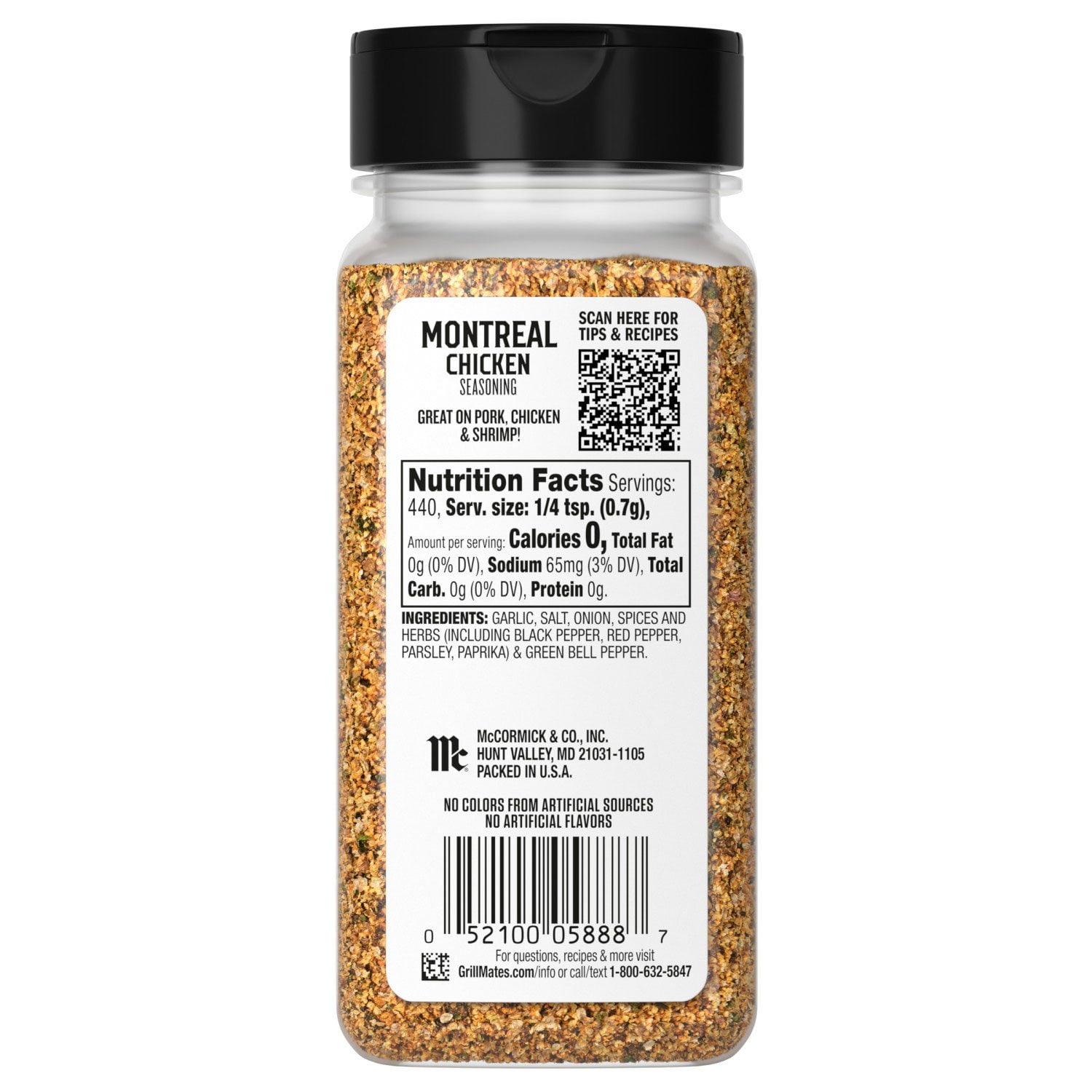 McCormick Grill Mates features a wide variety of on-trend seasonings to help you create perfectly flavored masterpieces. Deliver bold, mouthwatering flavors to your dishes with a shake of McCormick Grill Mates Montreal Chicken Seasoning. This seasoning is made with a robust blend of ingredients including garlic, salt, onion, and spices like black pepper, red pepper, and paprika.