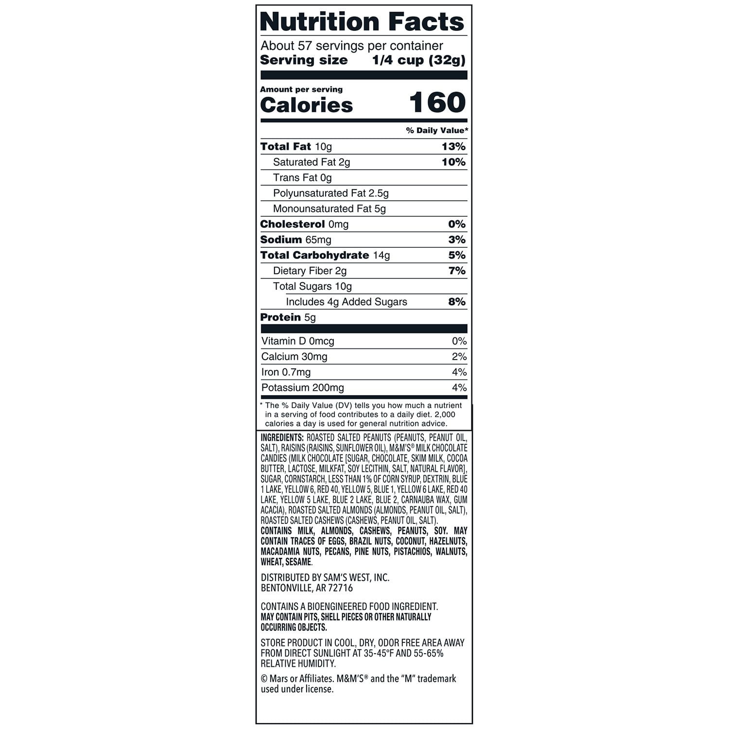 • Includes a delicious blend of peanuts, raisins, M&M’s® milk chocolate candies, almonds, and cashews