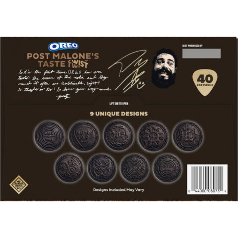 Post Malone & OREO Double Stuf Sandwich Cookies Variety Pack combines two delicious flavors of OREO Cookies for a most magnificent cookie mashup! Post Malone Taste Twist OREO Cookies are sweet snacks featuring swirled creme in limited edition snack cookies inspired by Post Malone. Posty’s Swirled Salted Caramel and Shortbread Flavor Creme is sandwiched between a bottom Golden OREO wafer and a top OREO chocolate wafer embossed with a randomized assortment of nine unique designs. The designs on these Post Malone OREO Cookies include the OREO and Post Vinyl and the Post Guitar Pick. This cookie variety pack also contains 25 snack packs of OREO Double Stuf Chocolate Sandwich Cookies, stuffed with delicious OREO creme filling! Packaging graphics feature Post Malone’s signature with a guitar pick background.