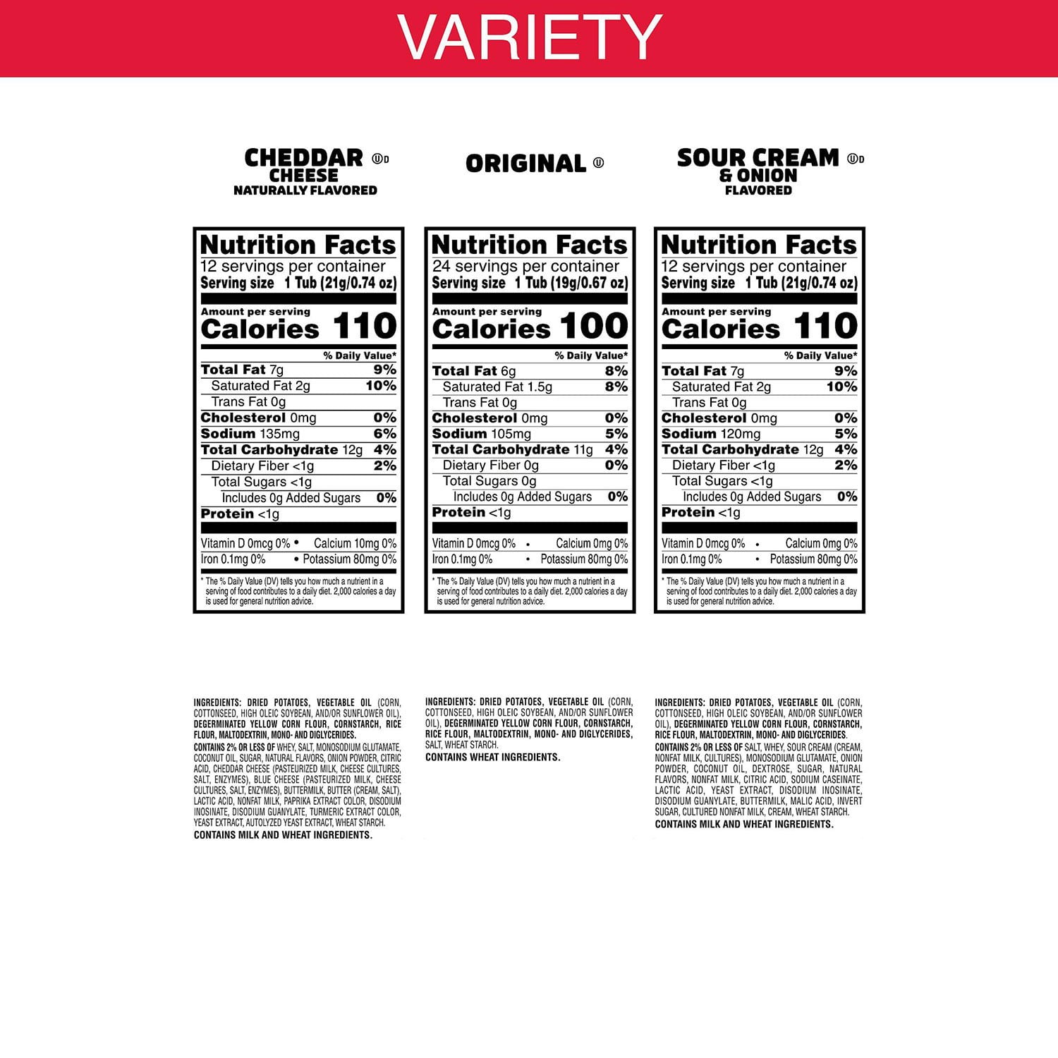In this variety pack, there are three distinctive flavors: original, sour cream & onion and cheddar cheese. Each flavor is unique and tasty.