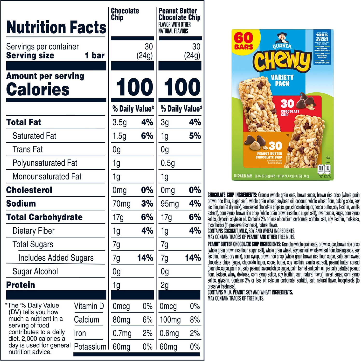 The variety pack includes two mouth-watering flavors: Chocolate Chip and Peanut Butter Chocolate Chip. Each box contains 30 individually wrapped bars of each flavor. Made without high-fructose corn syrup, these bars are not just tasty, but also a healthier alternative to many snack options available in the market.