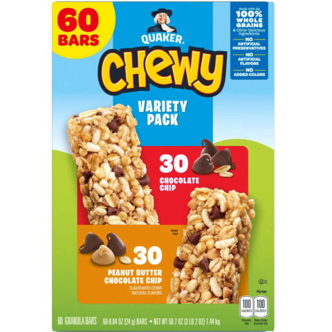 Quench your snack cravings with the Quaker Chewy Granola Bars Variety Pack. Each pack is filled with 60 individually wrapped bars, making it a perfect on-the-go snack for your busy day. With a blend of 100% whole grains and devoid of artificial flavors, these bars are a healthy snack option you can feel good about.