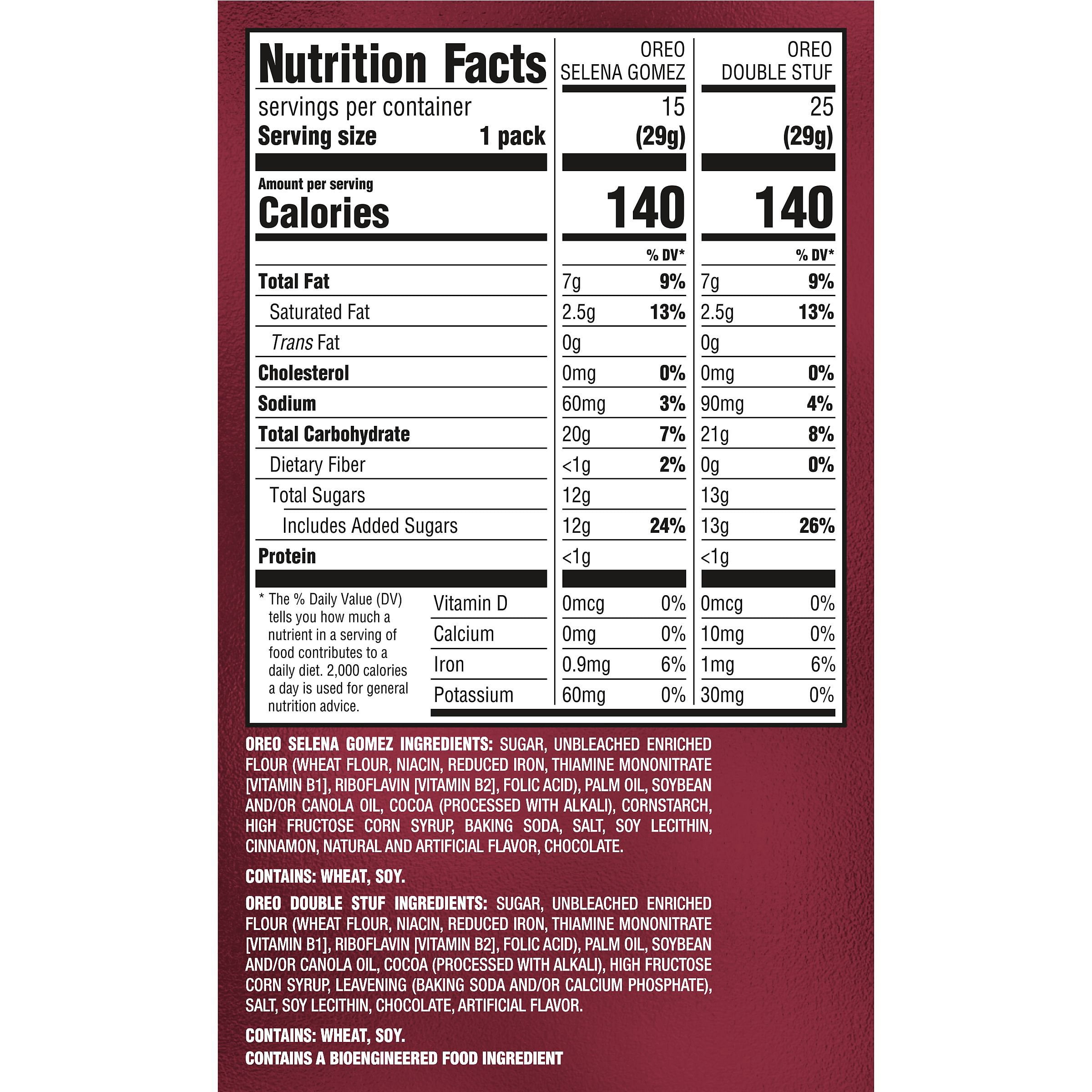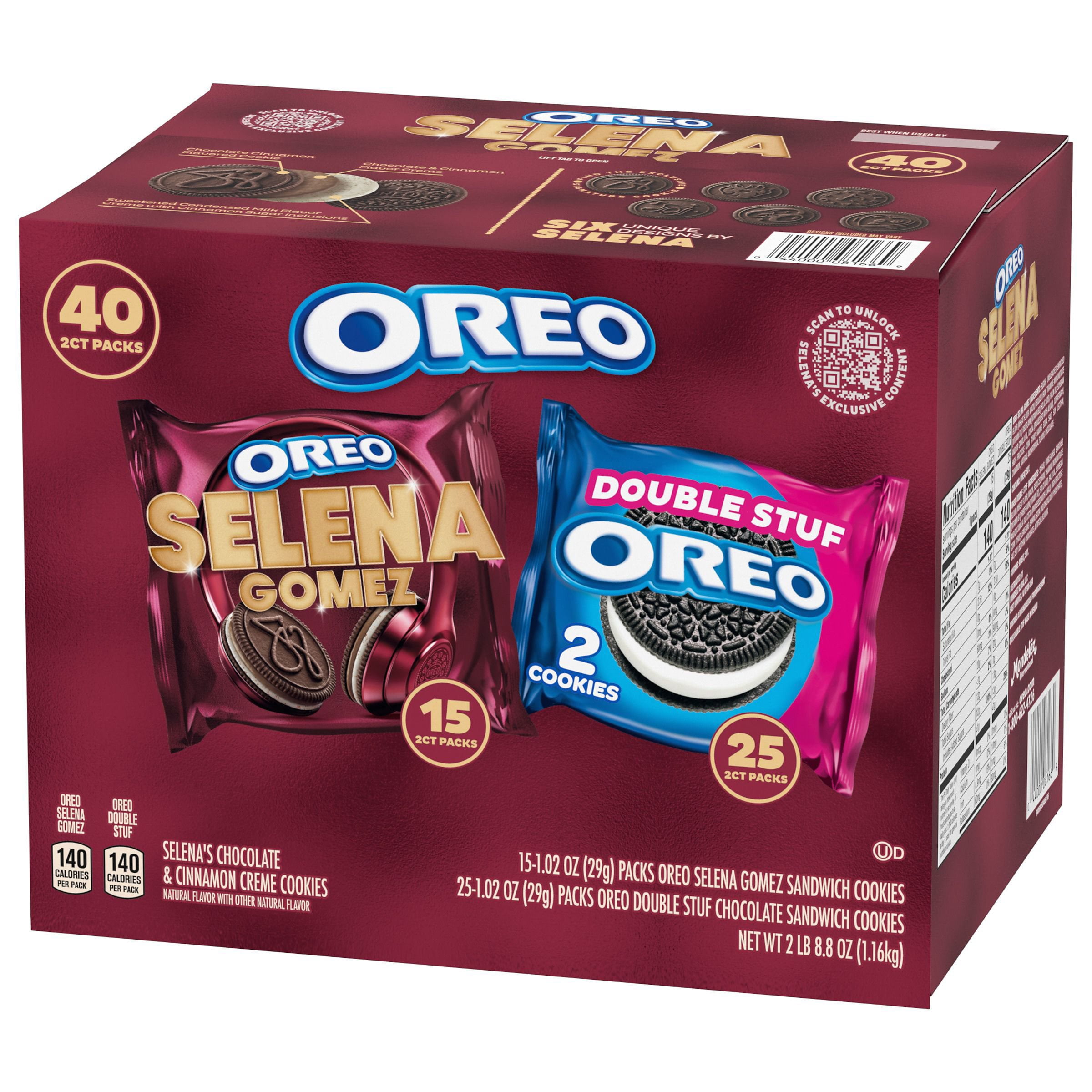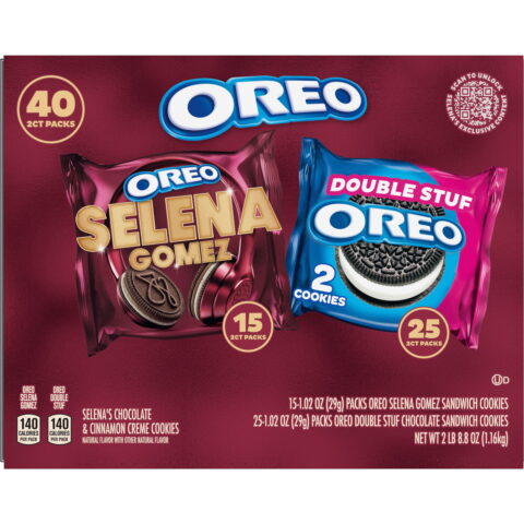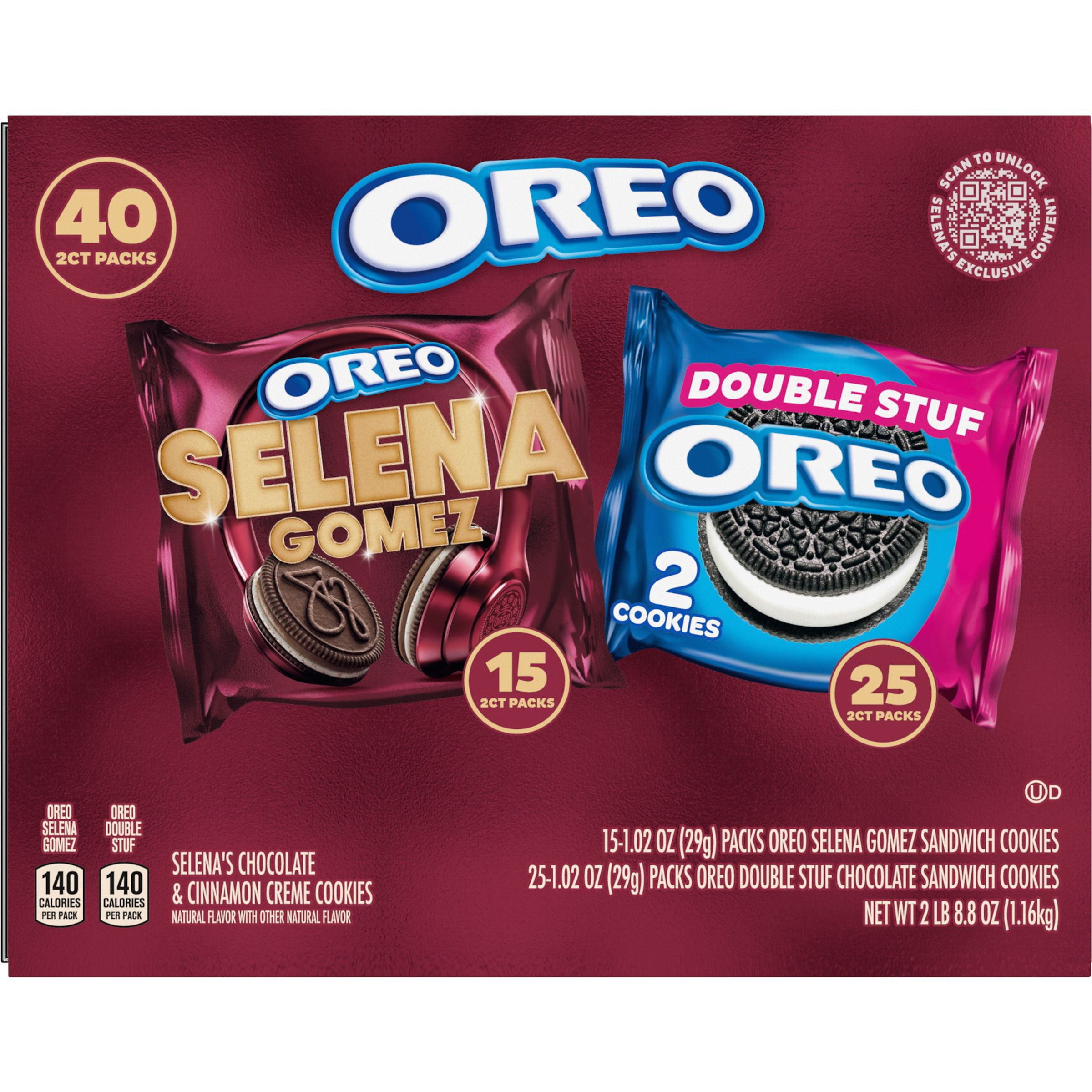 Try Selena’s Signature OREO Cookies in the Selena Gomez & OREO Double Stuf Sandwich Cookies Variety Pack, which combines two delicious kinds of OREO Cookies for a magnificent cookie mashup! Selena Gomez OREO Cookies are flavorful, horchata-inspired sweet snacks featuring a layer of Chocolate and Cinnamon Flavor Creme atop another layer of Sweetened Condensed Milk Flavor Creme with Cinnamon Sugar Inclusions, sandwiched between two OREO Chocolate Cinnamon Flavored wafer cookies embossed with one of six unique designs inspired by the superstar. This cookie variety pack also contains 25 snack packs of OREO Double Stuf Chocolate Sandwich Cookies, stuffed with delicious OREO creme filling!