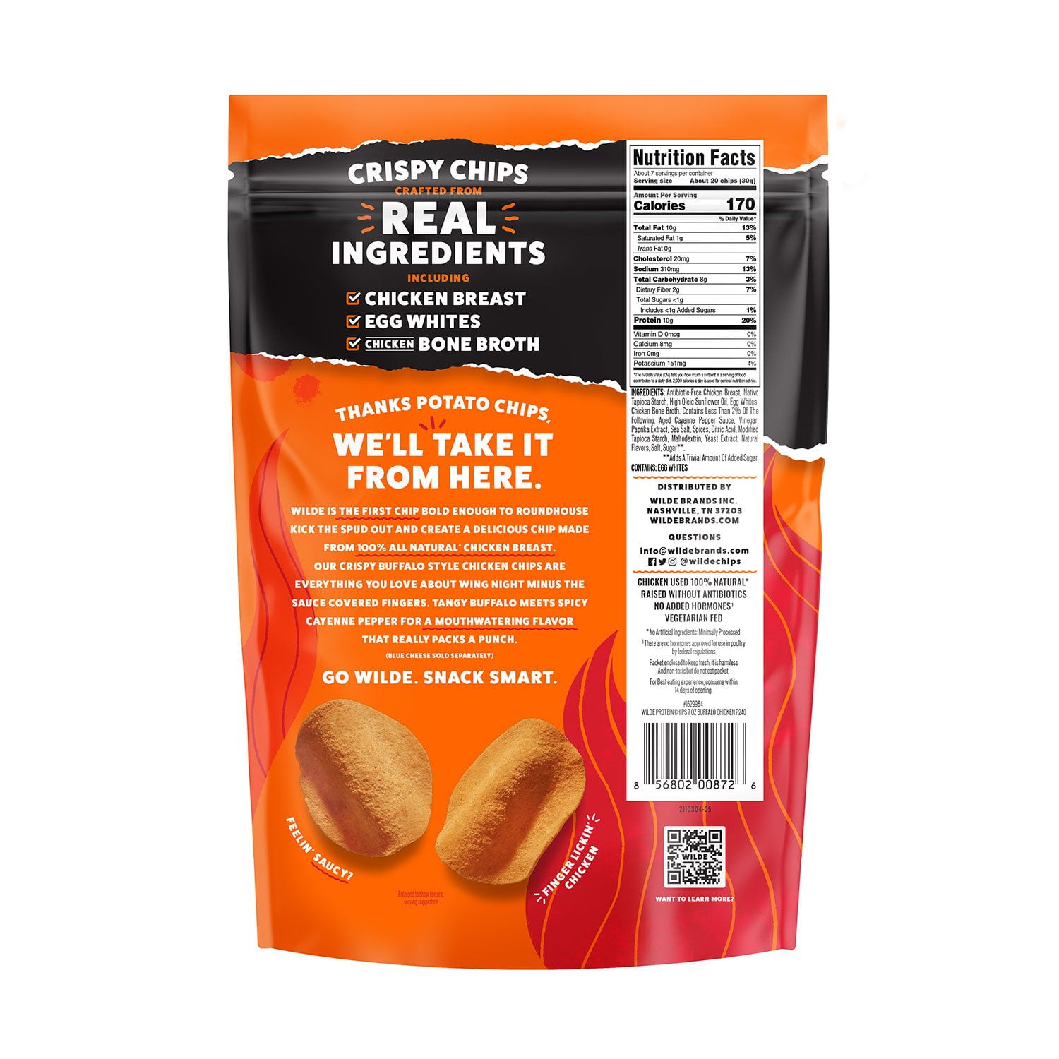 WILDE Buffalo Protein Chips are a delightful blend of tangy buffalo and spicy cayenne pepper, offering a mouthwatering flavor that really packs a punch. Made from 100% all-natural chicken breast, egg whites, and bone broth, these chips are a protein-packed snack that brings the excitement of wing night right to your fingertips, without the mess of sauce-covered fingers. Please note, blue cheese is sold separately.