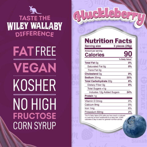 Wiley Wallaby licorice is a fat-free snack that doesn’t compromise on flavor. It’s packed full of taste, leaving less room for the things you’d rather avoid. It contains less sugar and absolutely no dairy or fat. Plus, all fruit flavors are free from High Fructose Corn Syrup, making Wiley Wallaby a healthier choice for your snack cravings.