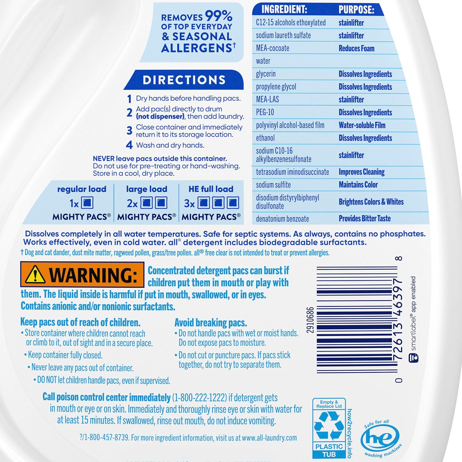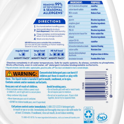 all MIGHTY PACS are 100% free of perfumes and dyes with concentrated cleaning power in a convenient pac. all free clear is the #1 recommended detergent brand by dermatologists, allergists and pediatricians for sensitive skin. These hypoallergenic MIGHTY PACS are tough on stains but gentle on skin. all free and clear MIGHTY PACS are unscented, fragrance free, and safe to use in any washing machine, including High Efficiency machines, and at any water temperature. One tub contains 120 laundry pacs. Use with all free clear fabric softener and dryer sheets for clean and soft clothes with static cling reduction in the dryer.