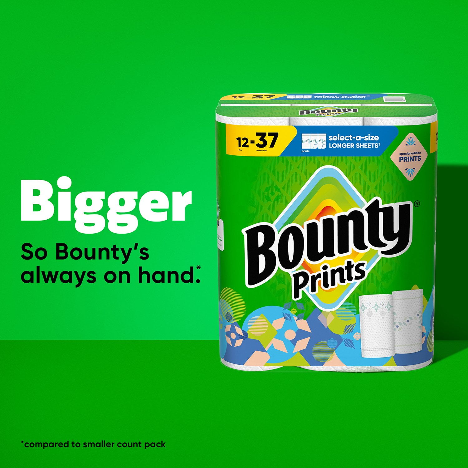 Bounty Paper Towels with Longer Select-a-Size sheets are longer than the National Market Select-a-Size sheets, so you can choose your sheet size depending on your mess. Buying in our larger bulk packs means you change the roll less often** to always have Bounty on hand. Never want to run out of Bounty, buy in bulk. These Printed designs are designed to complement your life no matter where they are used. Bounty always has your back in and out of the kitchen so whether it’s juice on the counter, ice cream on the table, or toothpaste in the bathroom, we make sure spills and messes won’t stand a chance. That’s why Bounty is the Most Awarded Paper Towel based on online media awards for the past 8 years.