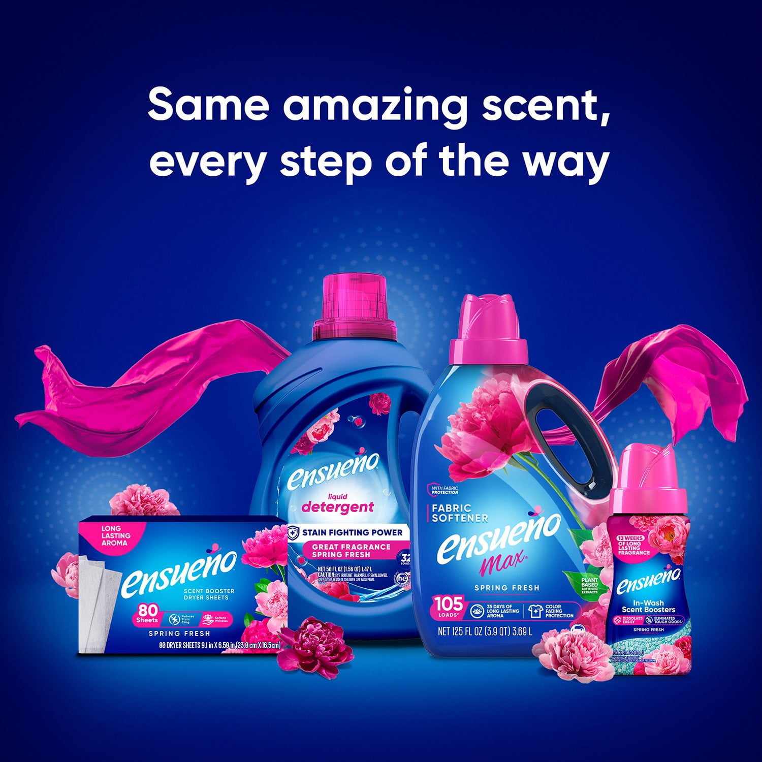 Enjoy the spring fresh scent of Ensueño Max Liquid Fabric Softener. With notes of apple, jasmine, and sandalwood, your clothes will smell great for up to 35 days from wash to wear. With its Fresh Spring scent, Ensueño is sure to become your favorite laundry necessity.
