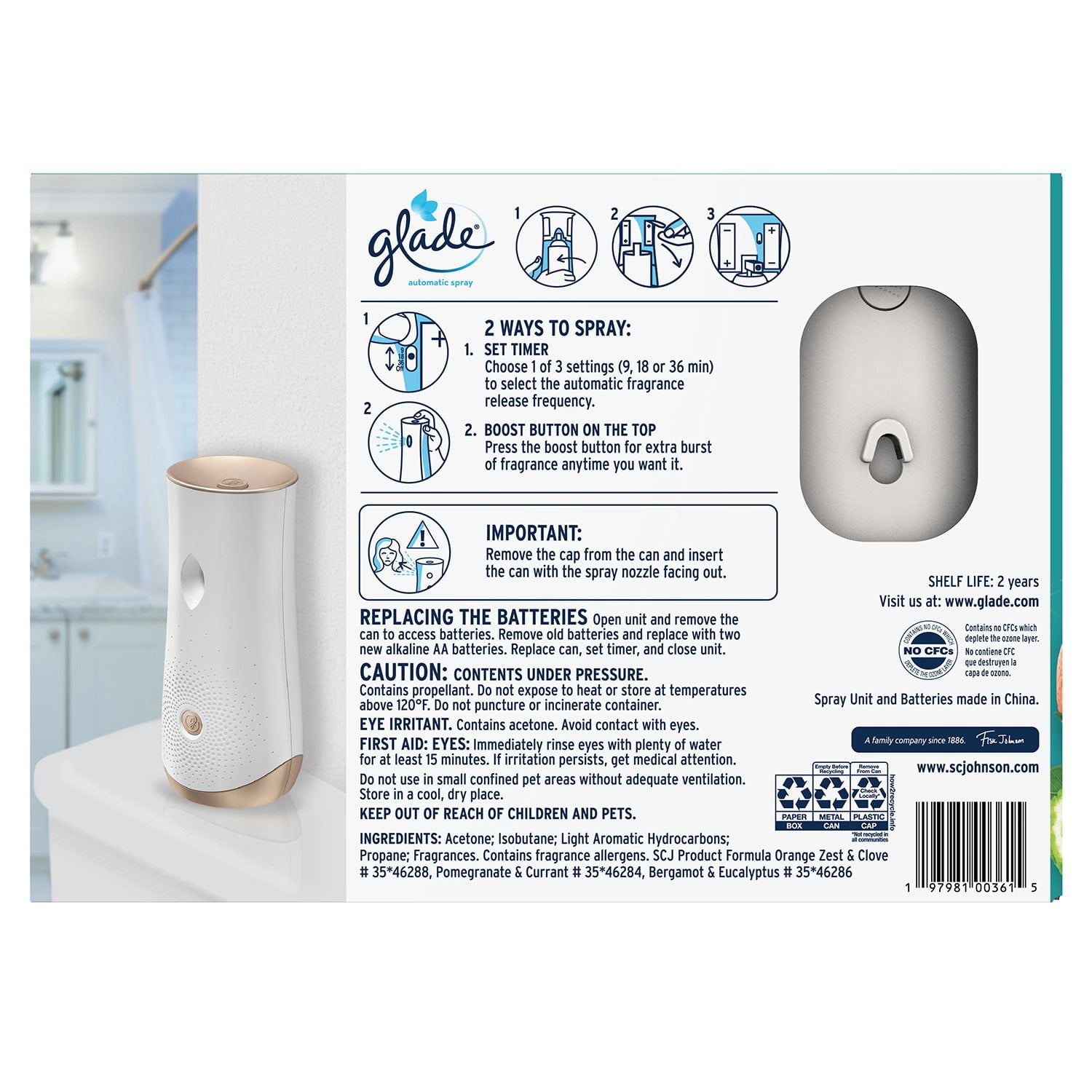 These fragrances are infused with essential oils and delivers a long-lasting scent every 9, 18 or 36 minutes. Our automatic sprayer refills are made without phthalates, parabens, formaldehyde and nitro musks. Fragrance refills are compatible with Glade® Automatic Spray Air Fresheners.