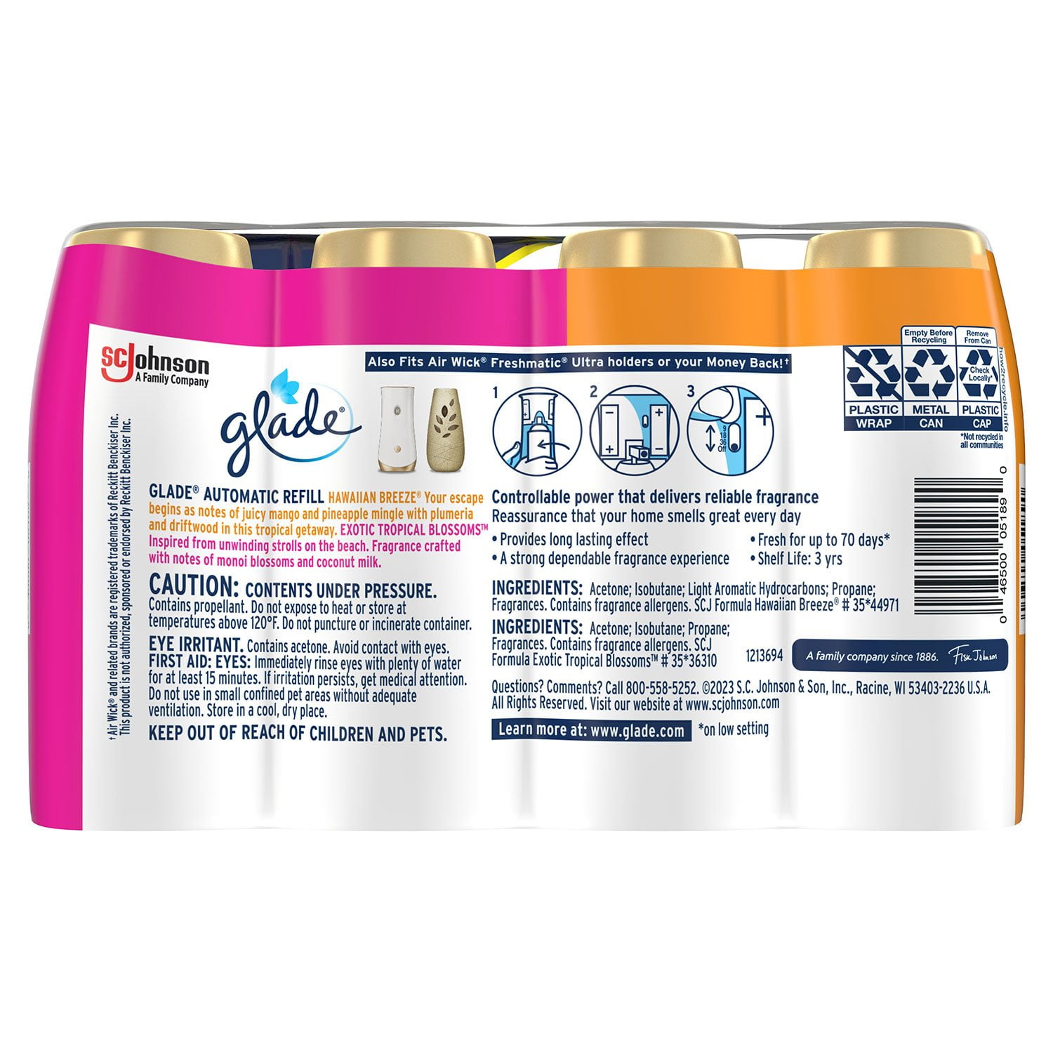 Take an exotic vacation from the comfort of your couch with Glade Hawaiian Breeze and Exotic Tropical Blossoms Automatic Spray Refills. Life’s a beach with scent diffuser with notes of ripe pineapple, hibiscus, and peach nectar or notes of monoi blossoms, melon and coconut milk. Glade air freshener fragrance is crafted by master perfumers. Switch things up with automatic air freshener dispenser in Hawaiian Breeze and Exotic Tropical Blossoms scent. Open the unit by squeezing the ribs on the side while pulling sides of holder apart. Insert Glade automatic spray refill and choose the time setting to release fragrance. This automatic air freshener spray gives a fresh burst every 9, 18 or 36 minutes. Surround yourself with room freshener fragrance infused with essential oils and reset the mood mindfully.
