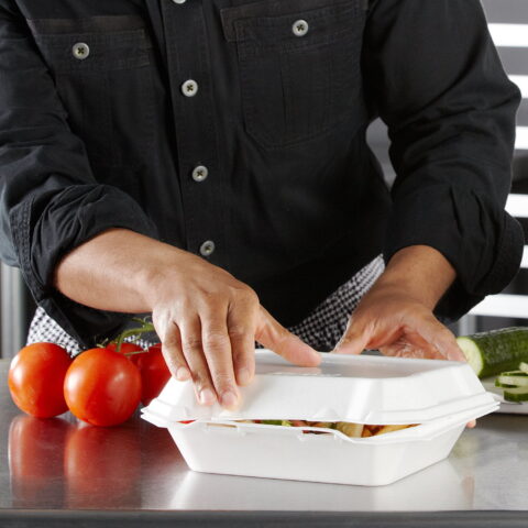 These foam containers with hinged lids are perfect for use in the food industry, in both restaurants and for catering companies. The containers are strong and sturdy, capable of holding a variety of entrees, like barbecued meats, spaghetti and meatballs, hot dogs and burgers, as well as tasty side dishes, like antipasto salads, baked potatoes, corn cobs and nachos or even desserts, like gooey pies, frosted cakes and more. Diners can bring home leftovers from restaurants, cafes, catered weddings, corporate events and more with ease and not have to worry about dips, slips, seeps or dents. The containers are also sturdy enough to eat out of and can easily be stacked in the fridge.