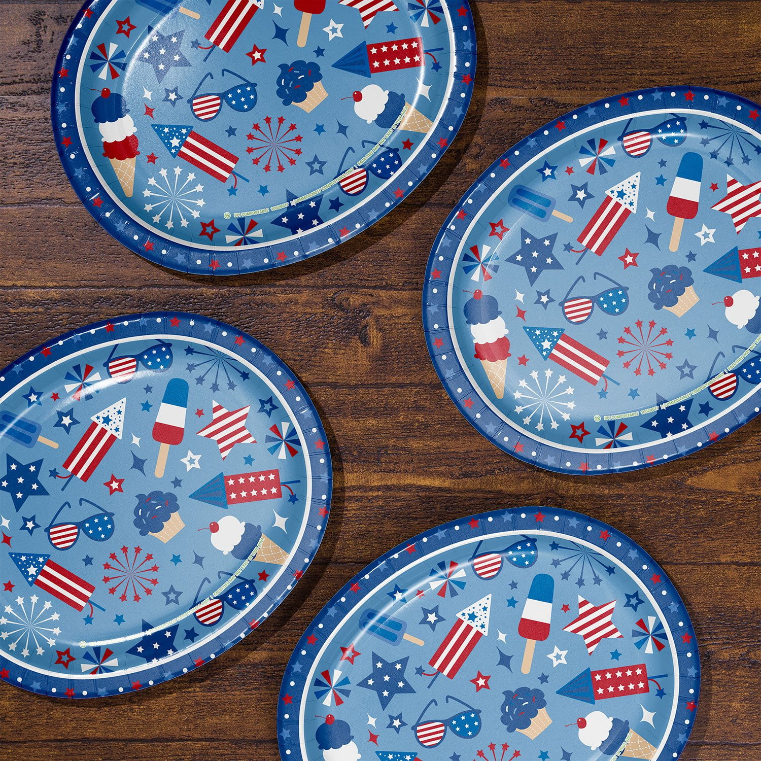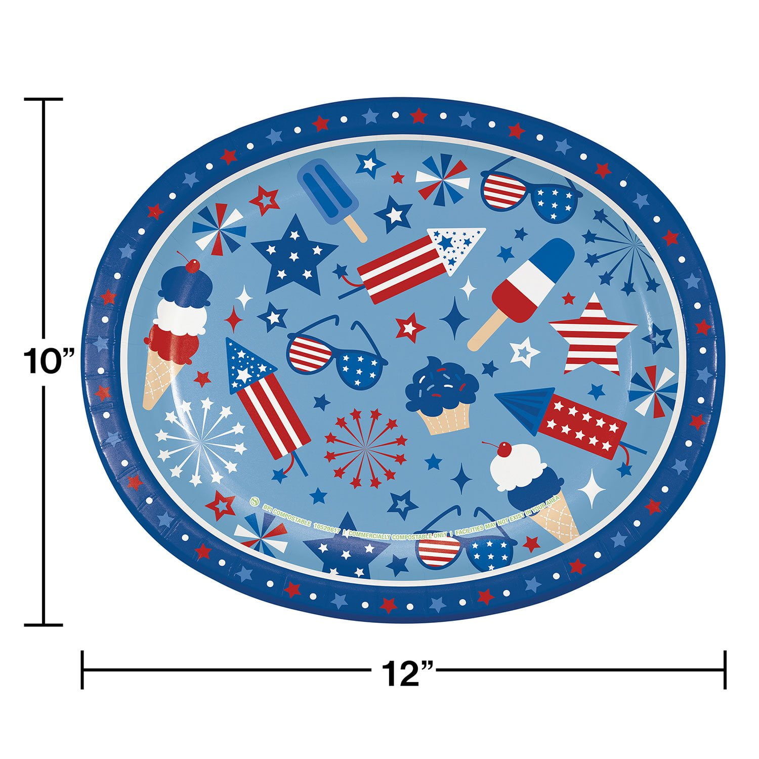 Ideal for summertime treats fresh off the grill, Fourth of July potlucks, or casual gatherings of family and friends, this Fun for the Fourth patriotic oval paper plate combines functionality with festive flair, making it a delightful addition to your holiday table.