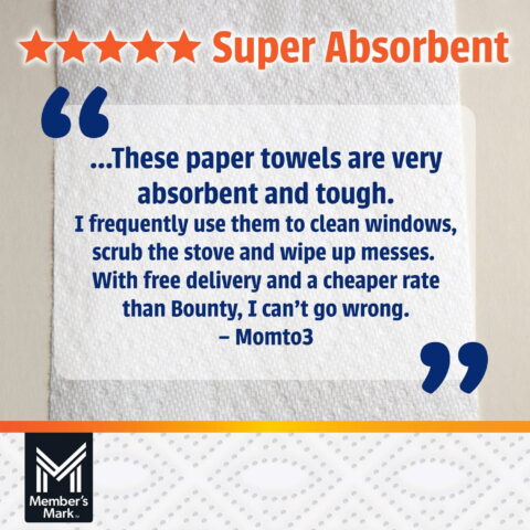 Member’s Mark Super Premium Paper Towels are extremely strong, making them suitable for more than just cleaning up spills. You can use them to wipe down a variety of surfaces such as glass, appliances, countertops, dishes, walls, and tile surfaces. Just lightly spray these towels with a suitable cleaner for spotless results. These towels are designed to meet all your cleaning needs.