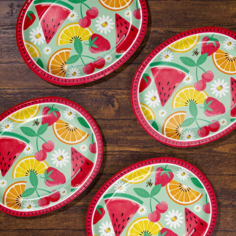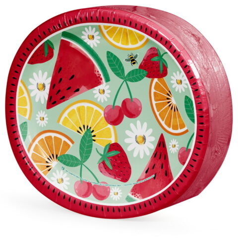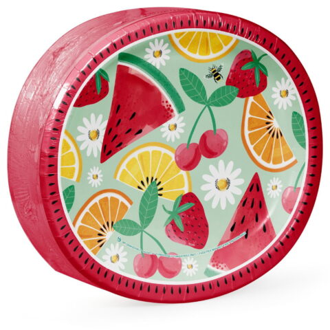Celebrate summer in style with our charming and durable Member’s Mark Fruity Tropics oval paper plates. Add a refreshing touch to your summer gatherings with this oval paper plate, designed to capture the essence of a tropical paradise. The plate features a delightful scatter design of vibrant summer fruits, including watermelon, pineapple, lemon and lime slices, strawberries, and lush tropical foliage. These playful elements are set against a stylish two-tone pastel blue cabana stripe background, evoking the relaxing vibe of a beachside retreat. Ideal for picnics, barbecues, or any warm-weather event, this sturdy paper plate combines practicality with charm. Whether you’re hosting a summer party or enjoying a casual get-together, this plate adds a playful, tropical flair to your event. Easy to dispose of after use, it ensures your celebration remains stress-free and full of color.