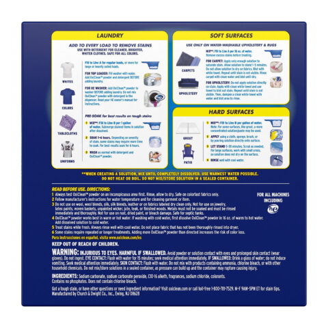 OxiClean Concentrated Max Efficiency Versatile Stain Remover Powder (8.08 lbs.), with our new formula, has more cleaning power in every pound!* Our strongest formula available has been concentrated so you can use less per scoop while getting the same powerful clean and same number of uses as the previous 10.1 lbs. size. Keep your laundry looking brand new, thanks to the power of oxygen. It’s safe for whites and colors, so use it in every load or around the home. When used as directed, its oxygen-based water-activated formula safely gets tough dirt and grime out of clothes, carpets and nearly any surface in your home.