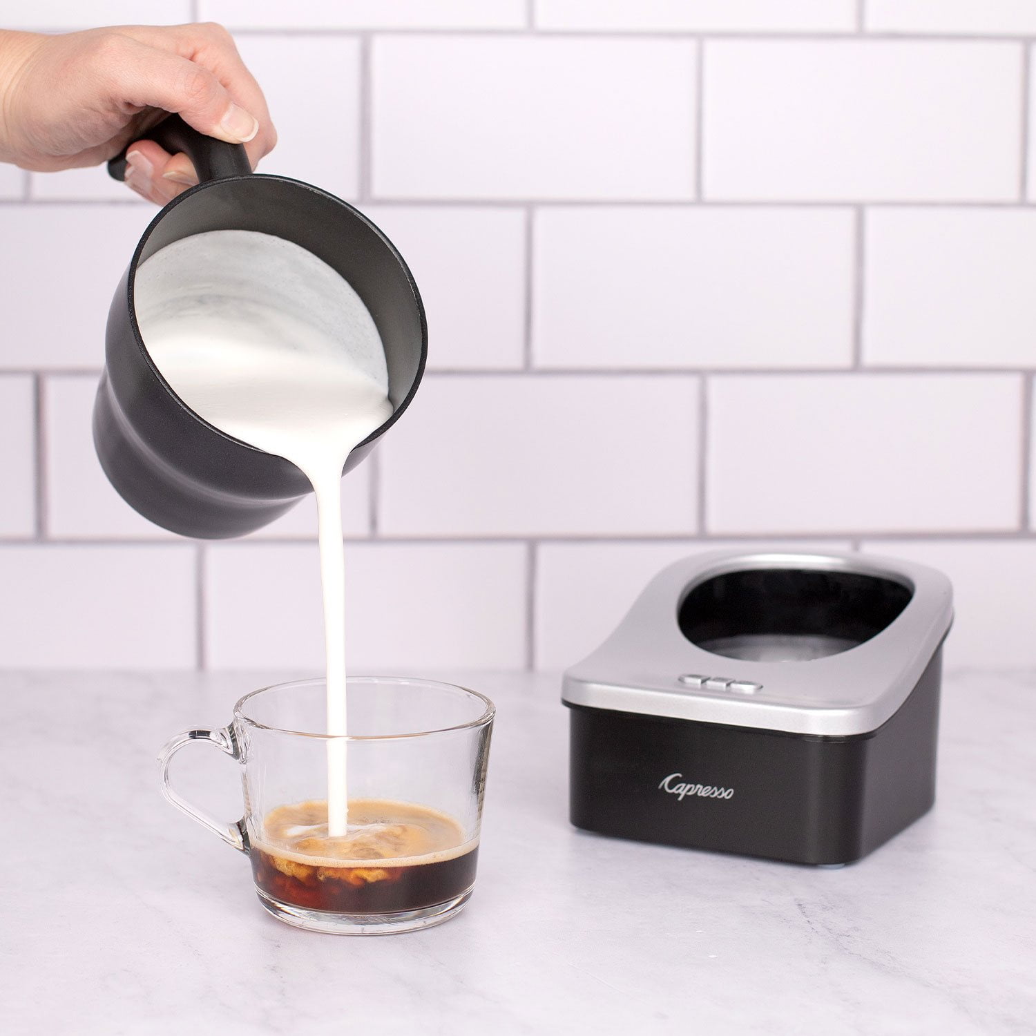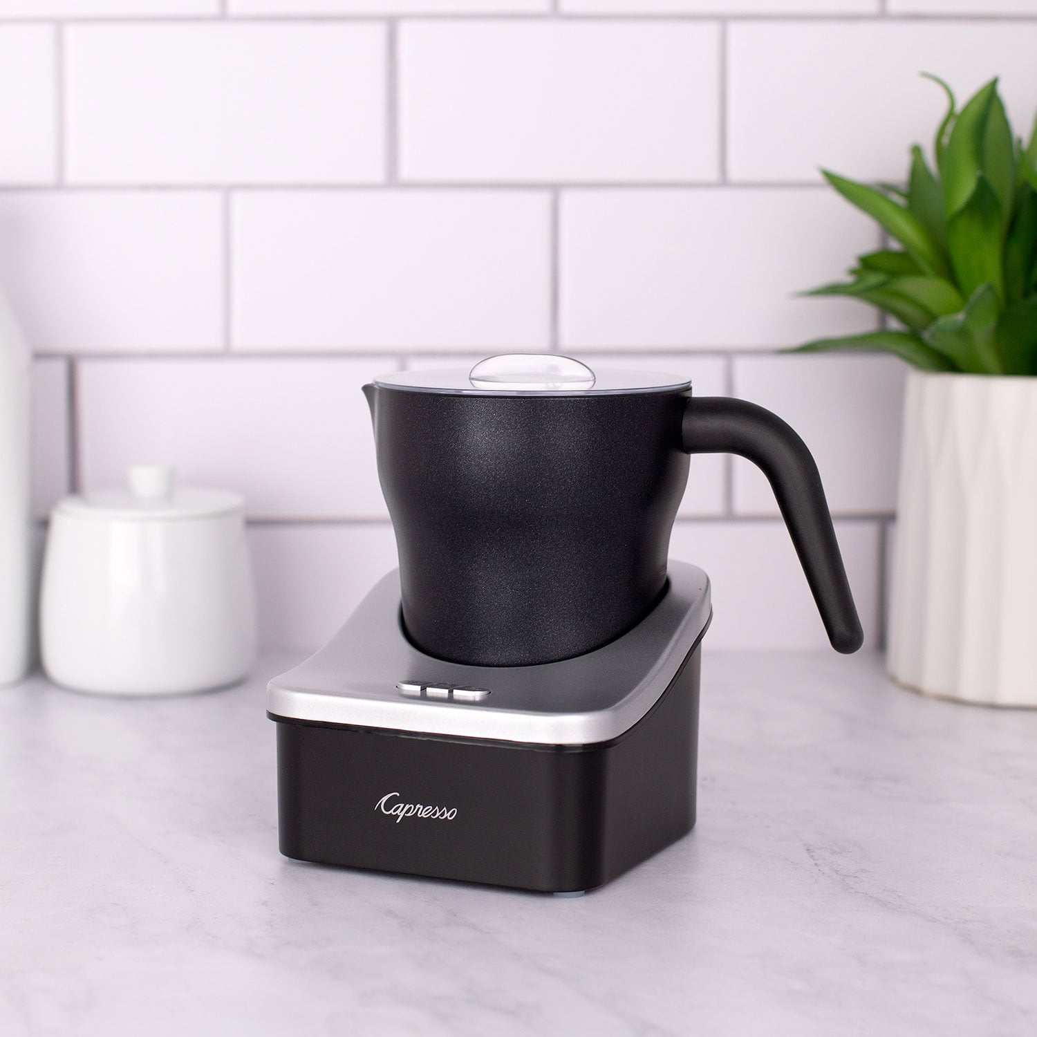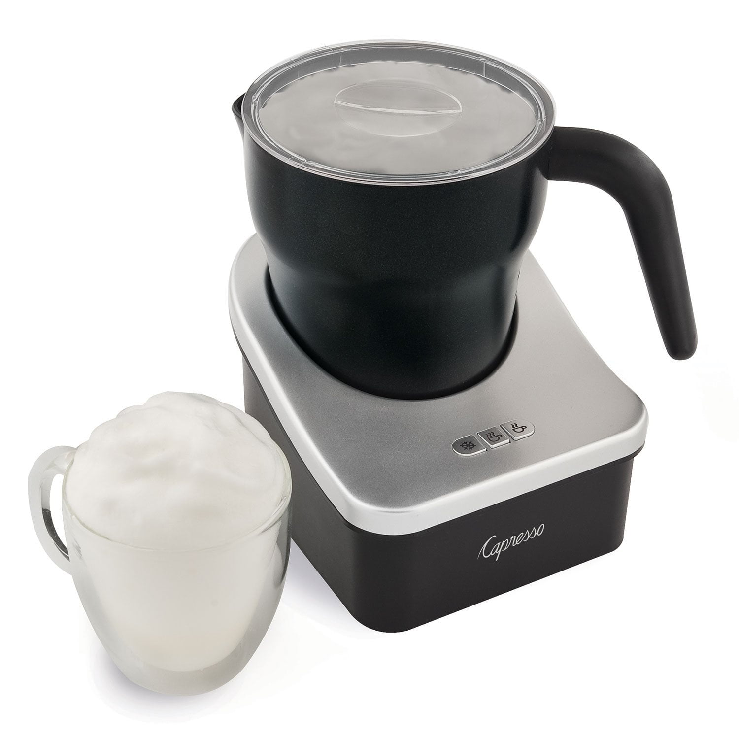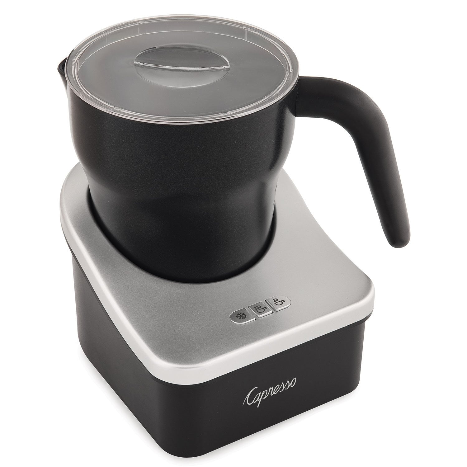 The Capresso automatic milk frother makes delicious hot or cold milk froth instantly. This compact milk frother is perfect for cappuccinos, café lattes and hot chocolate. The large-capacity milk pitcher is dishwasher safe with a see-through lid.