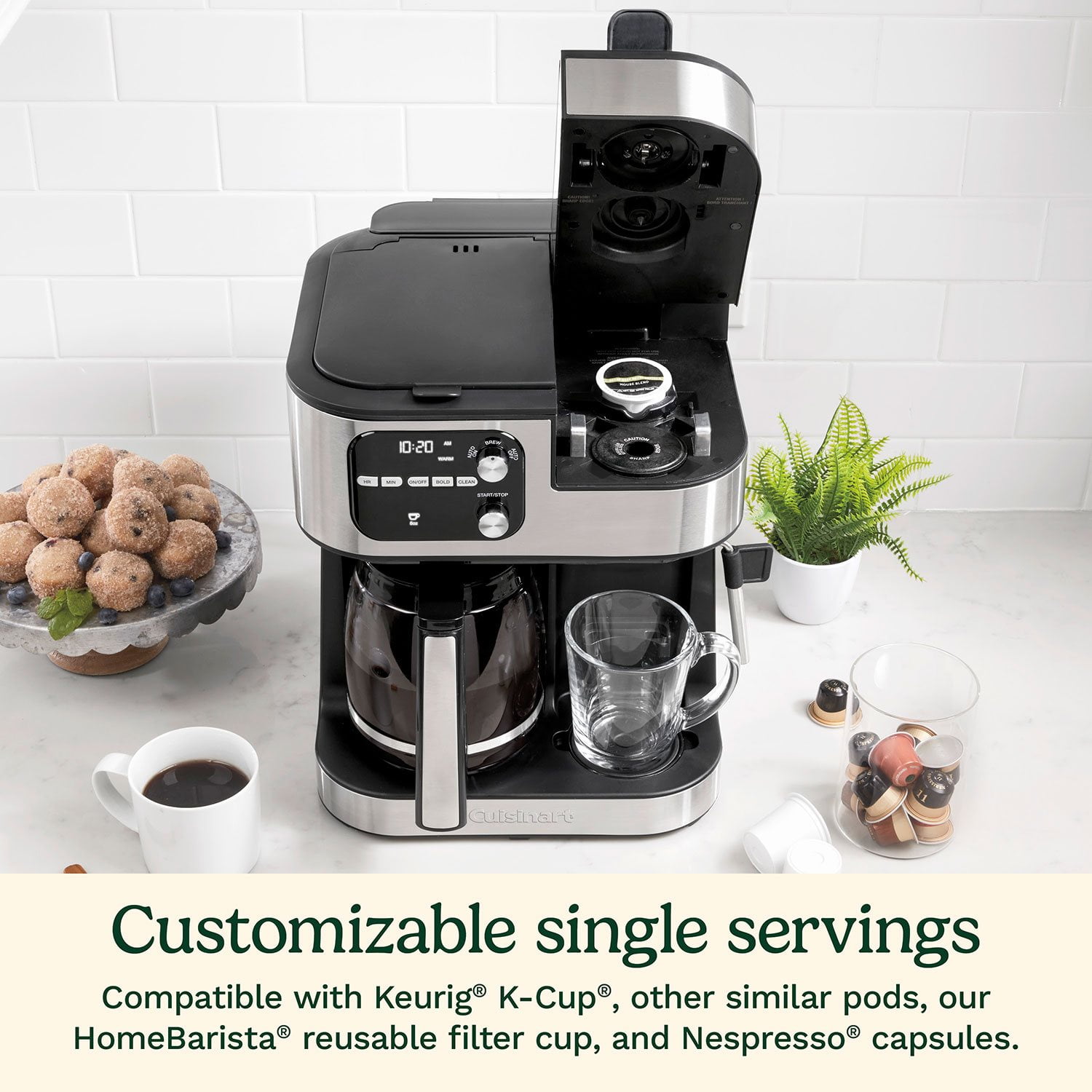 For those who love bold flavors, the Cuisinart® Coffee Center® Barista Bar accommodates Nespresso® OriginalLine-style capsules, allowing you to create single or double shots of espresso. The steam wand adds versatility, enabling you to froth and steam milk for cappuccinos, lattes, or your favorite specialty drinks.