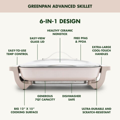 Featuring a spacious 12” x 15” cooking surface and a 7-quart capacity, this skillet is designed to handle a variety of cooking tasks. Whether you’re frying, sautéing, steaming, simmering, searing, or stir-frying, it’s perfect for preparing large meals for the entire family.