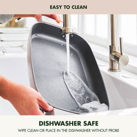 Cleaning up is a breeze with this skillet. Simply wipe it clean after use or place it in the dishwasher for added convenience. Note that the probe should be removed before placing it in the dishwasher.