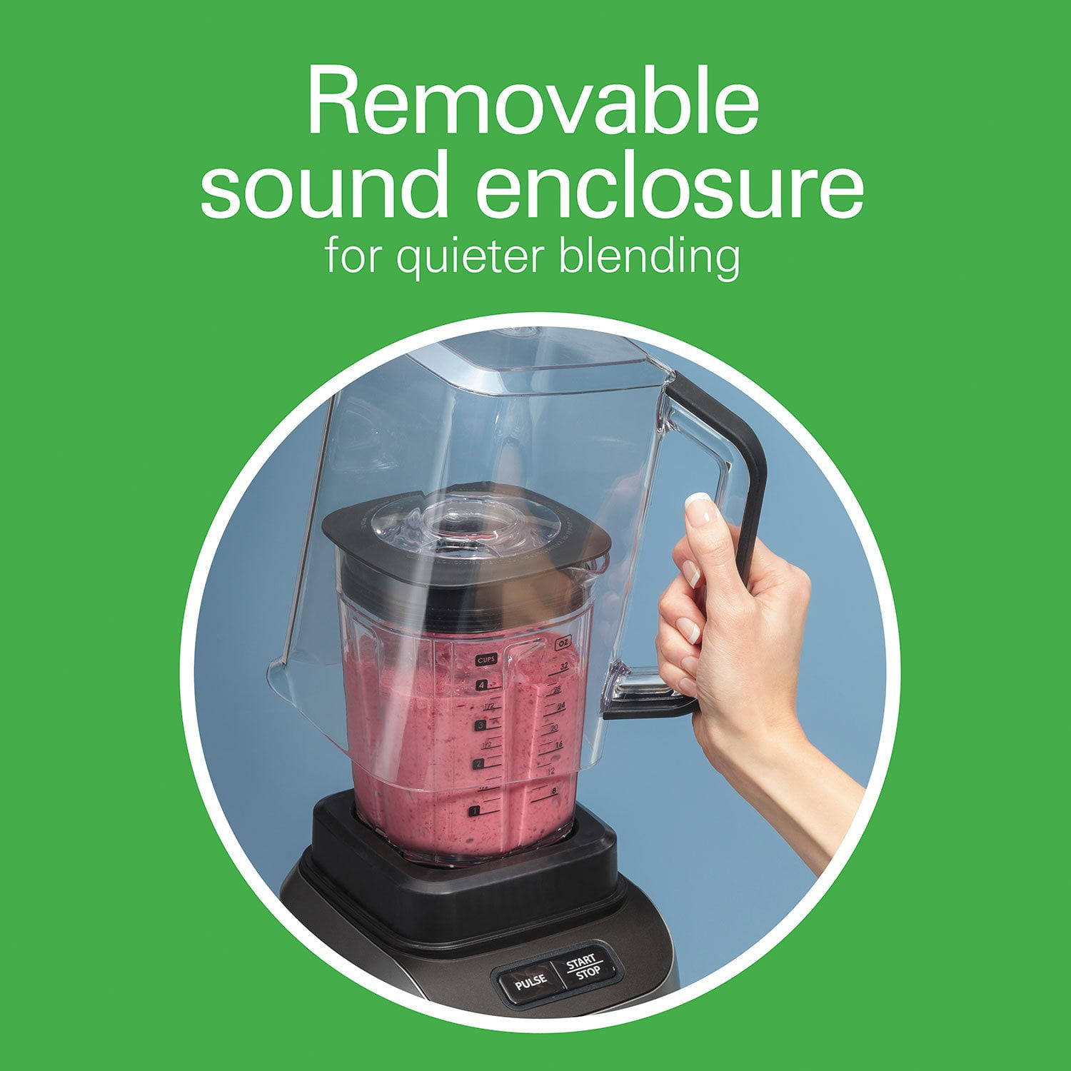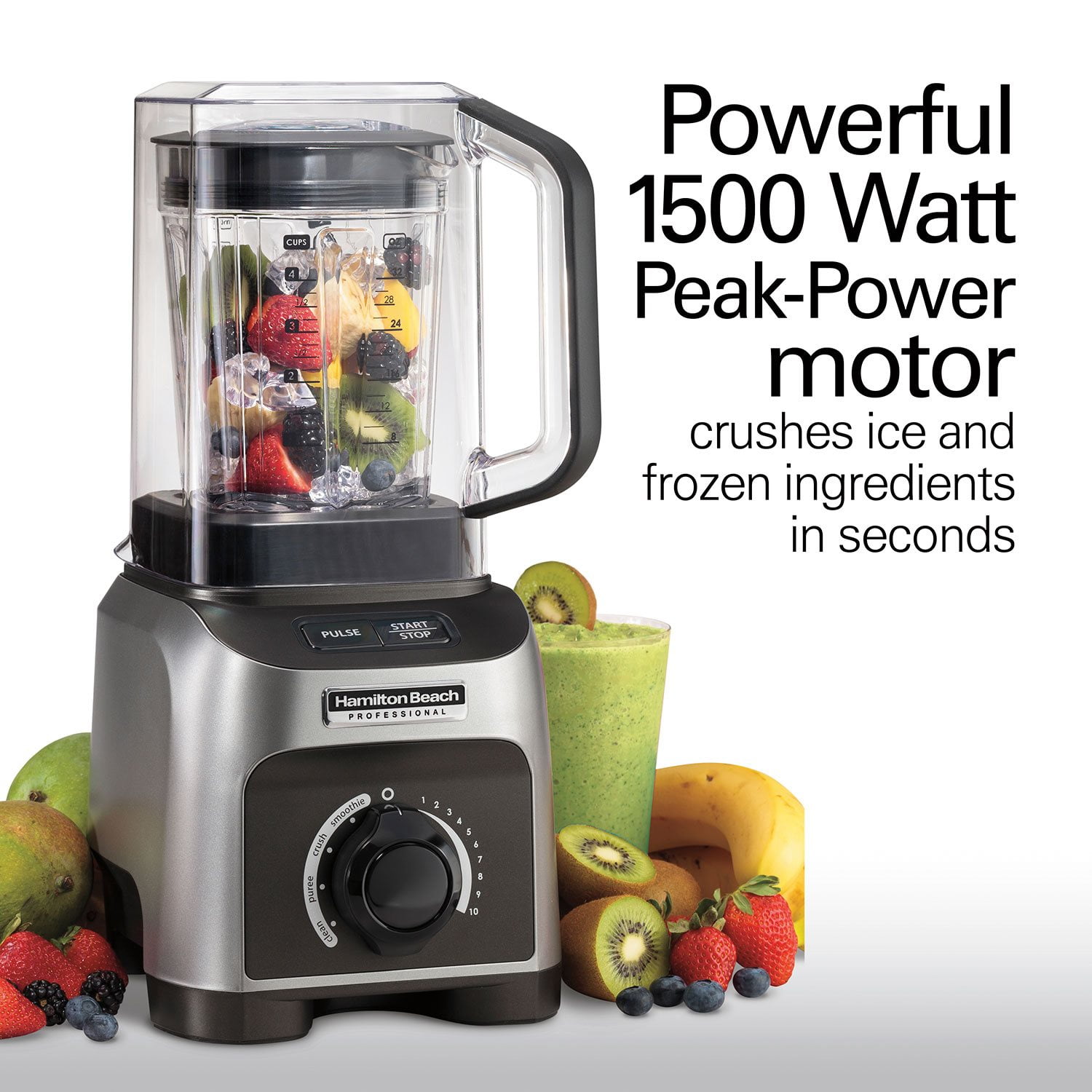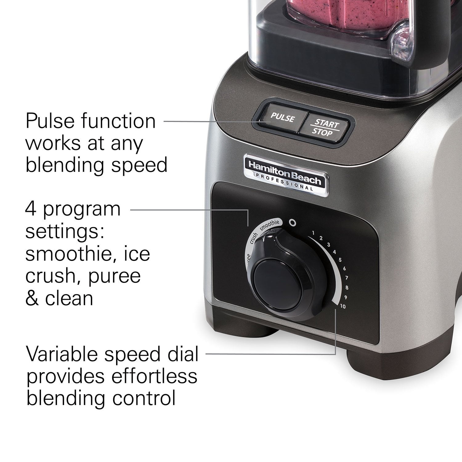 With the Hamilton Beach Professional Quiet Blender, you can effortlessly create perfectly blended smoothies, juice whole fruits and vegetables, puree hot soups, emulsify dressings, and grind spreads. The variable speed dial allows you to control the blending process to achieve restaurant-quality results every time. For one-touch convenience, choose from pre-programmed smoothie, ice crush, or puree settings. The blender also comes with a tamper to help blend thick or frozen mixtures.