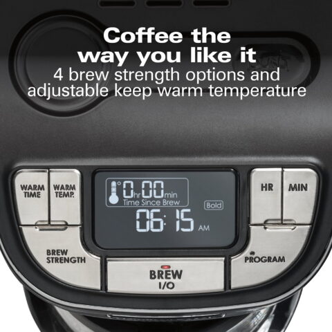 This programmable coffee maker lets you start every day with fresh, hot coffee. Program the 24-hour advance brew start for a fully automatic morning cup.