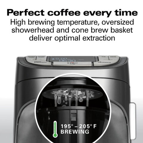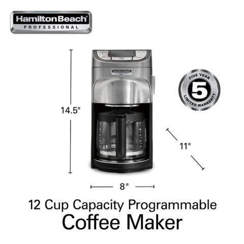 Enjoy perfect coffee every time with the Hamilton Beach Professional Programmable Coffee Maker. It has high-performance brewing to fully extract coffee’s rich, balanced flavor. The high brewing temperature, oversized showerhead and cone brew basket evenly saturate coffee and provide optimal extraction. The removable 60-oz. water reservoir and swing-open cone brew basket make filling easy.