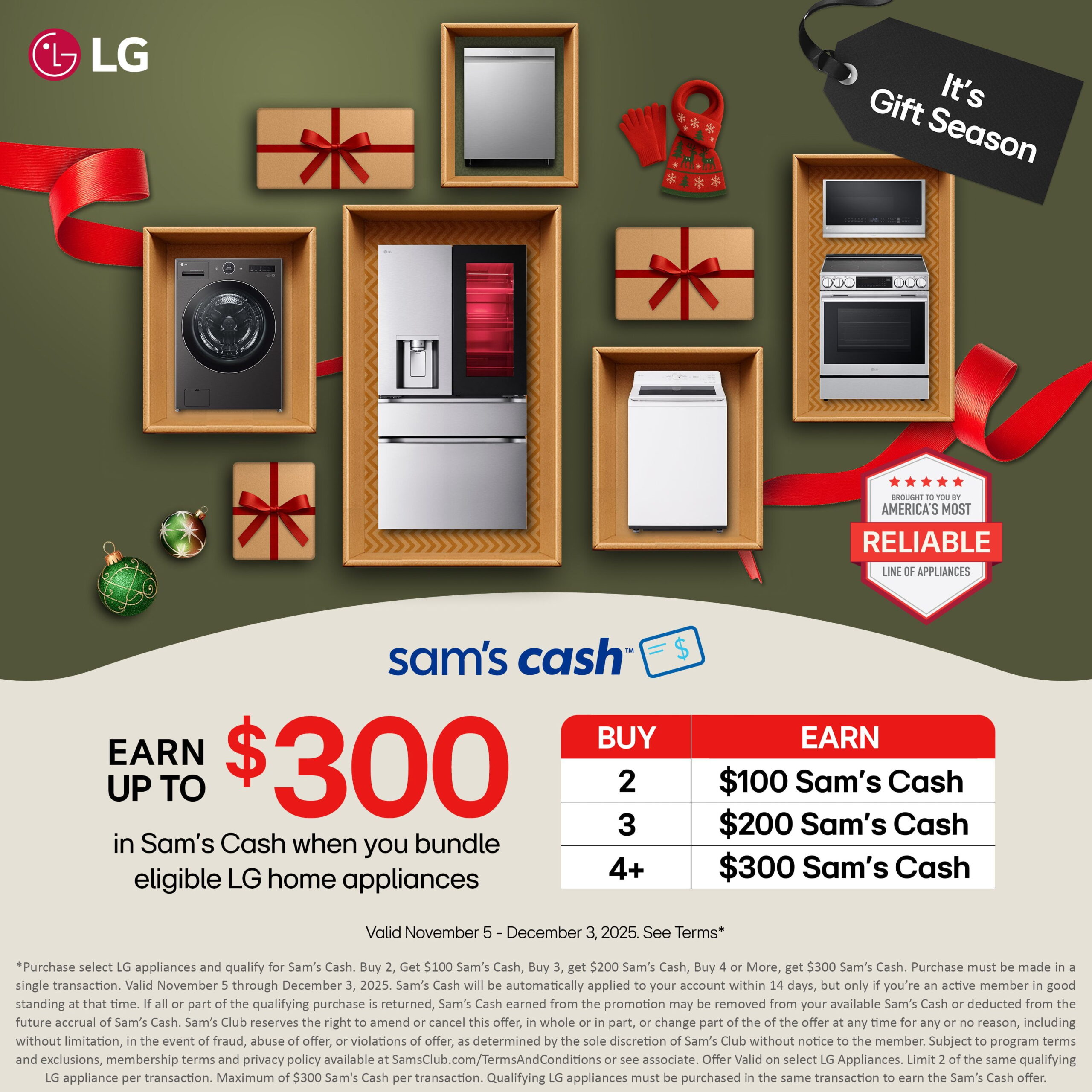 • Buy 4 or more select LG appliances, earn $300 Sam’s Cash